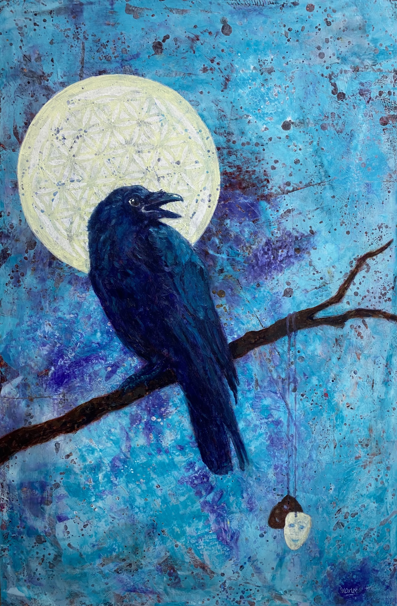 Yellow Blue Maan Olieverf Painting Flower Moon Symboliek Masker Kraai Animal Healing Spirituality Symbolism Mask Crow Krachtdier Floweroflife Marloesbuigelboering Poweranimal Bloemdeslevens