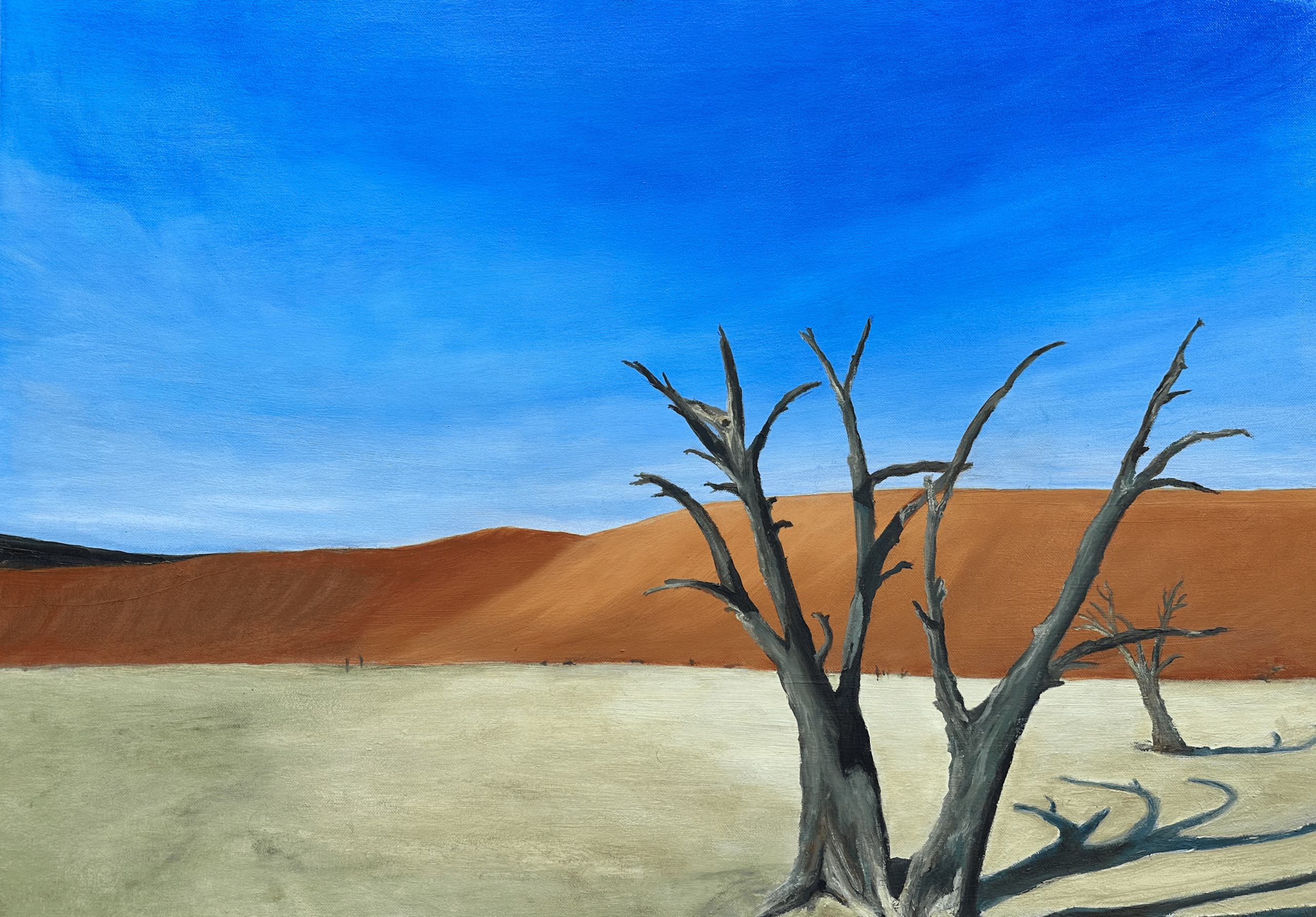 Een derde keer de Sossusvlei op het doek zetten. Zo mooi daar, zo verstild en krachtig. Een gebied waar 800 jaar terug een rivier was. De rivier is opgedroogd, de bomen zijn dood maar staan er nog wel steeds.