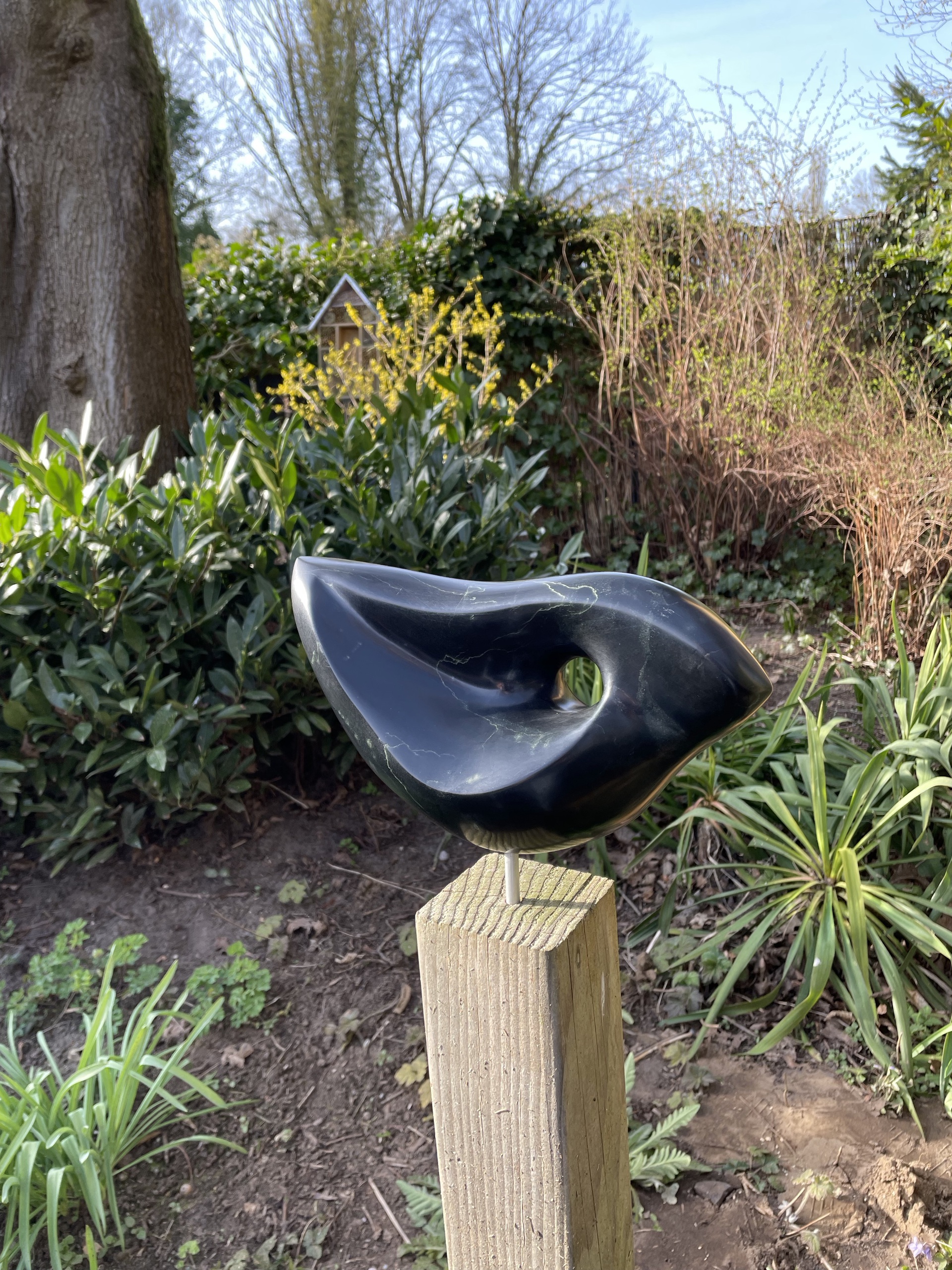 Abstracte vogel uit zwart serpentijn.