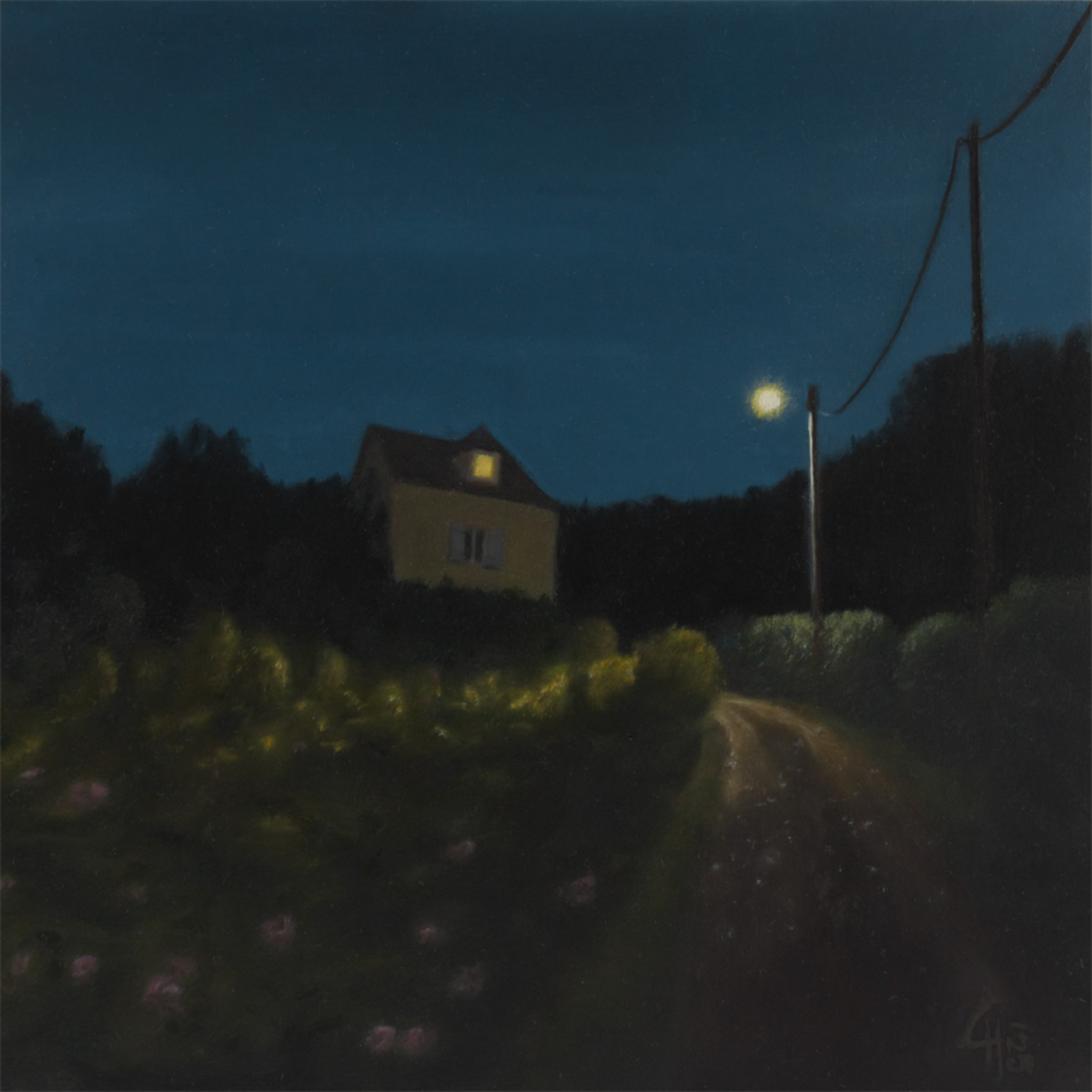 Nachtschilderij van een weggetje dat, verlicht door een straatlantaarn, heuvelop loopt naar een klein huisje. Daar brandt op de bovenverdieping nog licht.