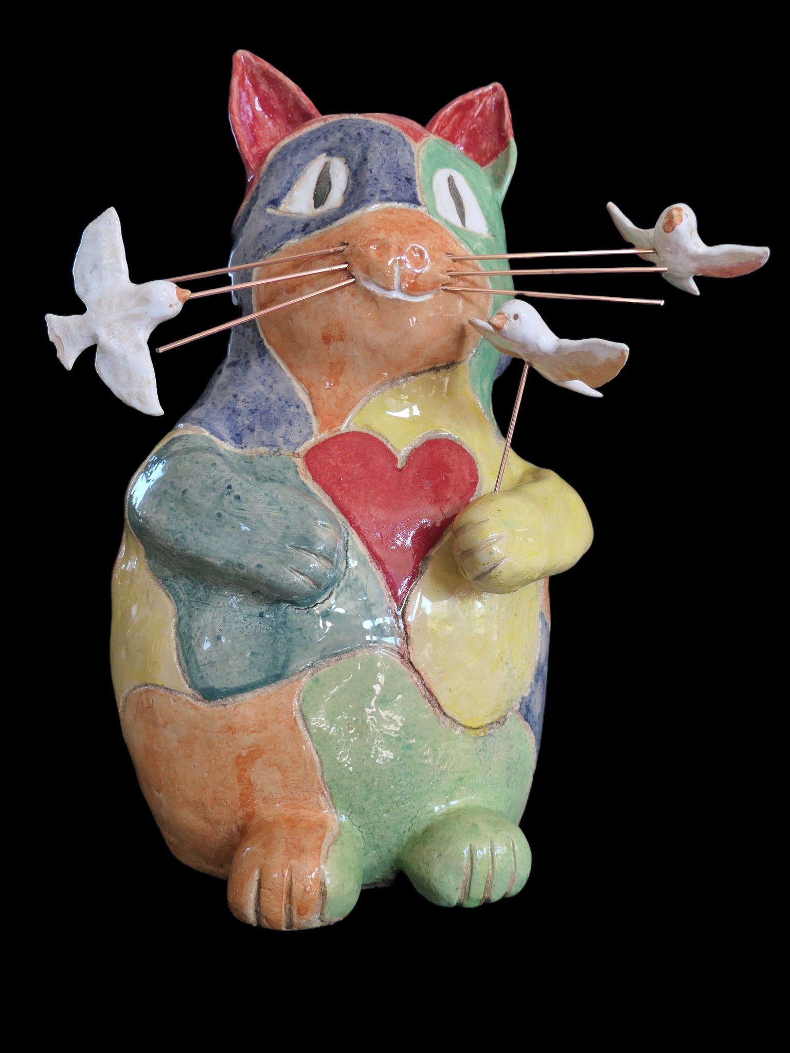 Kat Poes Keramiek Steengoed Dier Vrede Vogel Vogels Liefde Vrolijk 3d Abstract Beeld Tuinbeeld Tuinfiguur Interieur Orgineel Uniek Kleuren Kleurrijk Hart