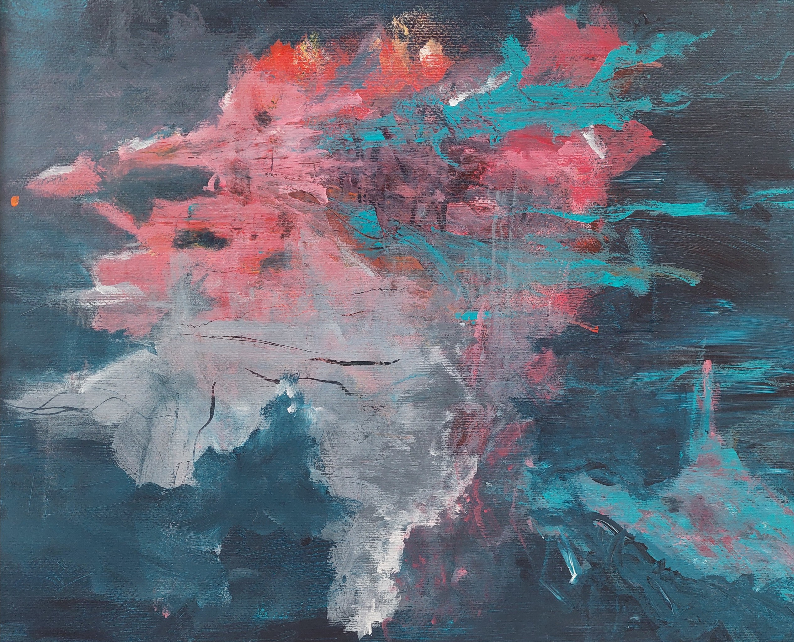 Een explosie van kosmische energie, waar vurige rood- en blauwtinten dansen als een ontluikende nevel in de oneindige duisternis. De penseelstreken suggereren beweging, alsof sterrenstof en gaswolken zich vormen tot iets nieuws en mysterieus.