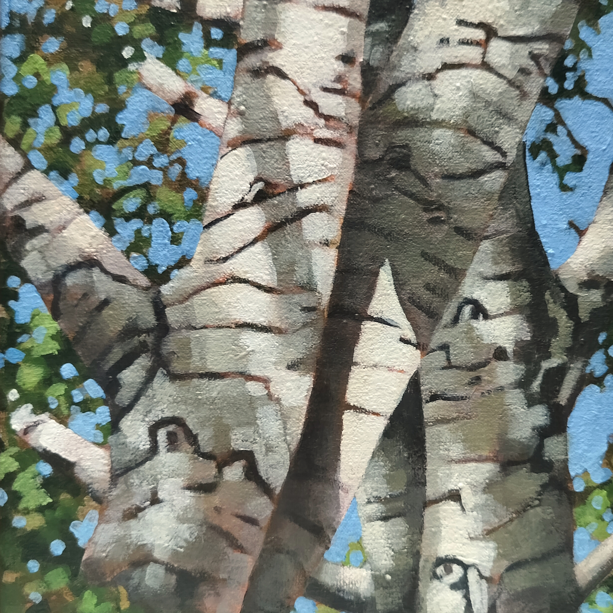 Dit schilderij geeft een impressie van het licht op de stammen van de abelen in het bos op een zomerdag.