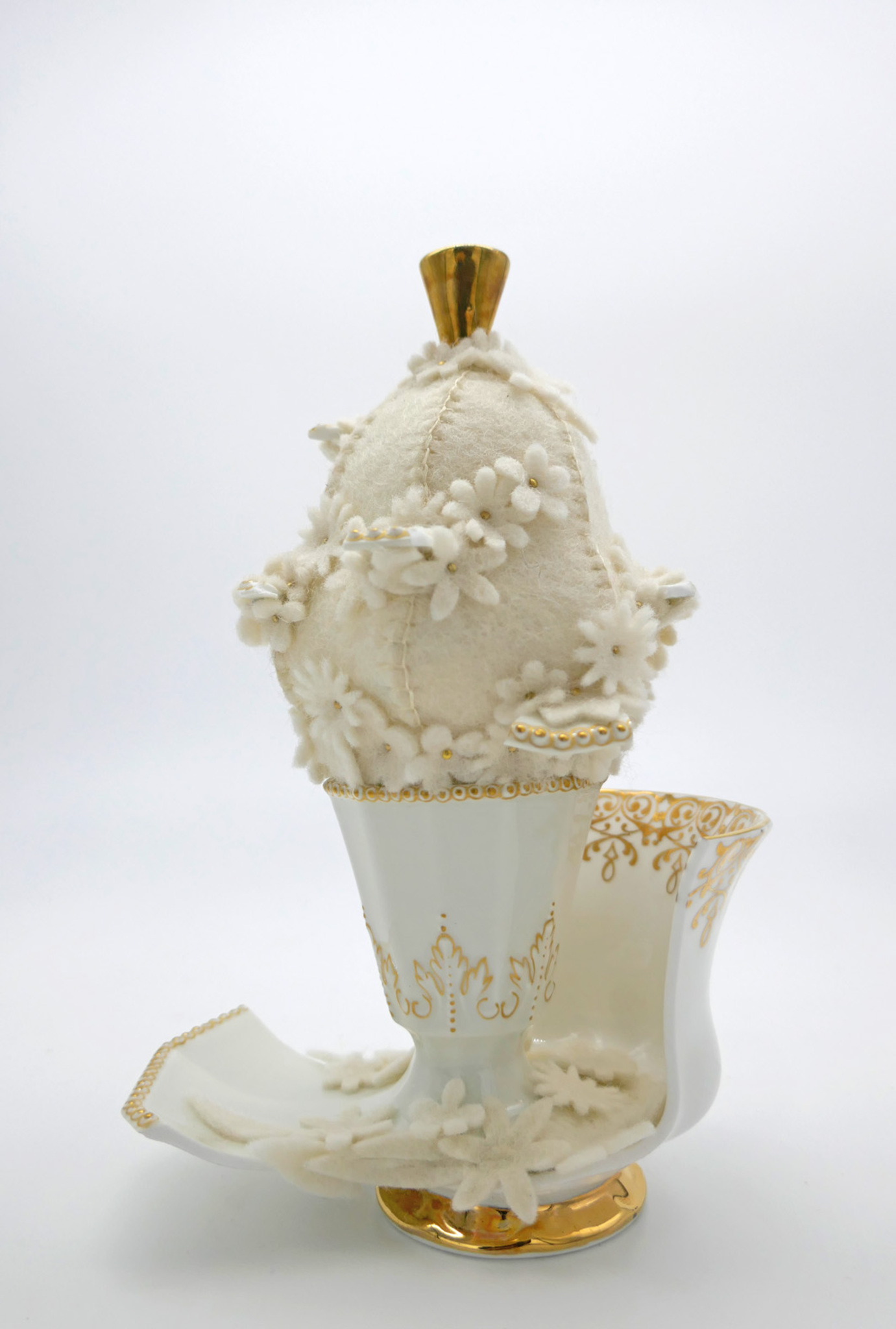 Deels handgeverfd wol vilt, foam, spelden, kapot deels met goudluster verguld porselein.