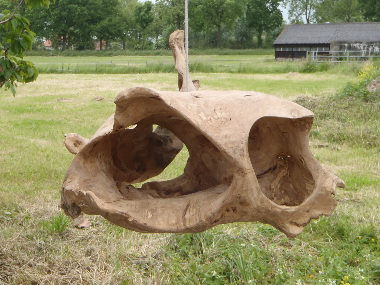 Zeer abstracte, surreeele vis gemaakt van een eikenstobbe. Hangend aan een draad, vrij hangend een mooi element in een tuin. Duurzaam door de gebruikte houtsoort.