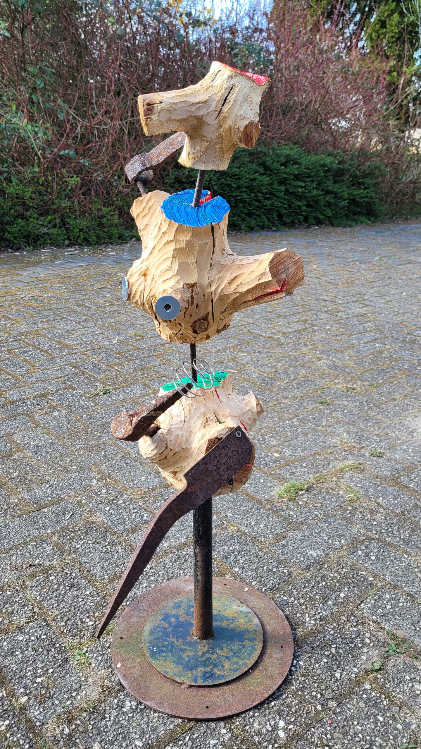 Materiaal: kersenhout, metaal, oud ijzer en acrylverf