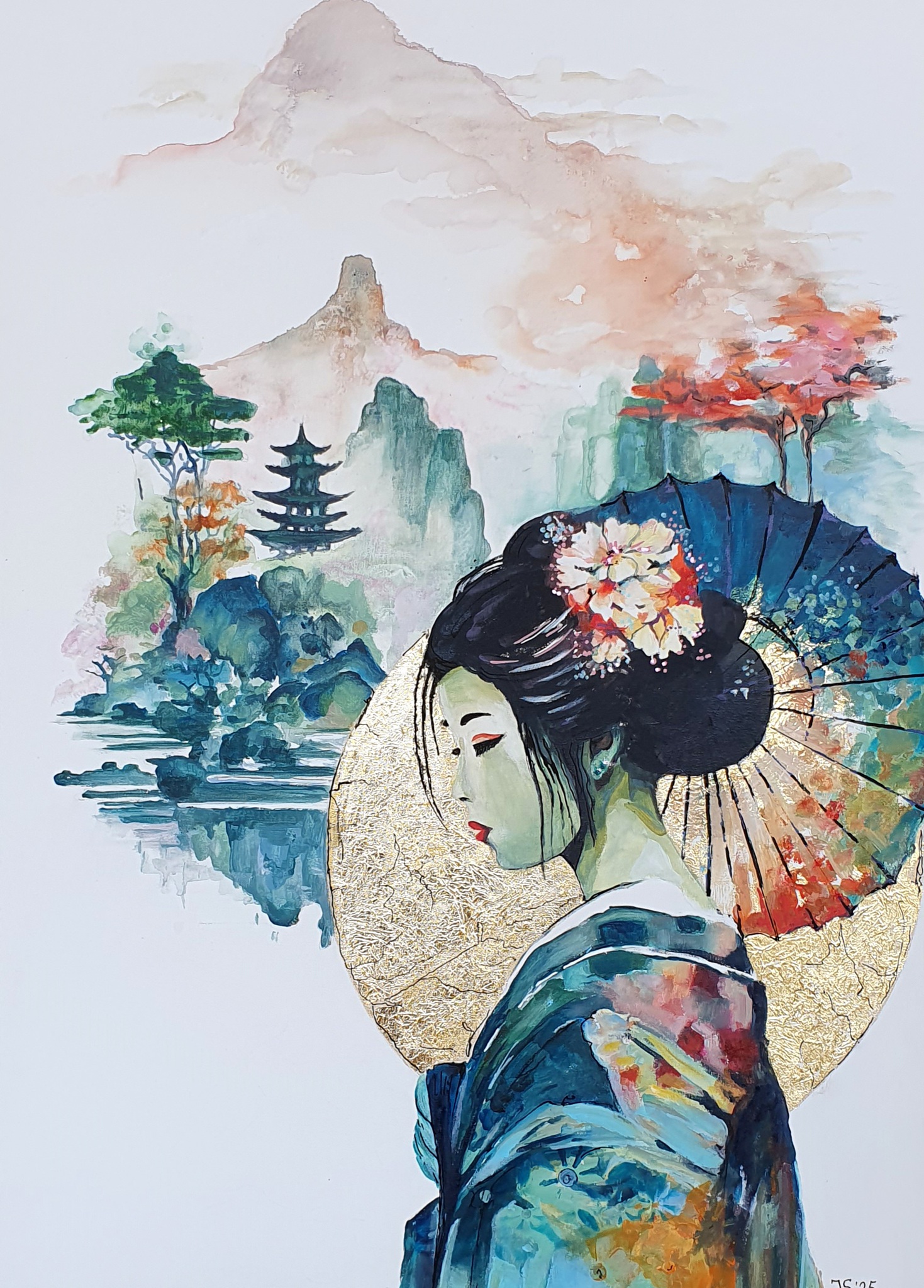 Nog een werk in de japanse sfeer met bladgouden cirkel, maar met een aquarel achtige achtergrond. Dit werk is alleen als kunstkaart te koop en op werkaandemuur.nl