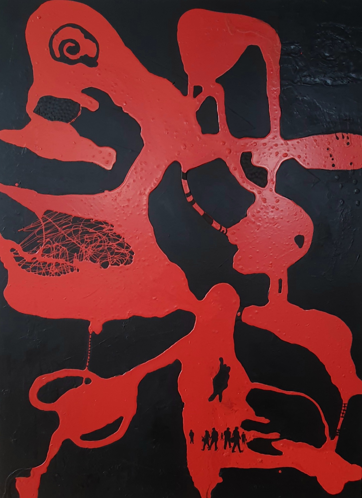 Zwart geverfd doek, waar rode verf op gegoten is En met zwarte stift bewerkt. Naar een voorbeeld van Geert Jan Jansen...gewoon gieten en kijken wat het wordt.