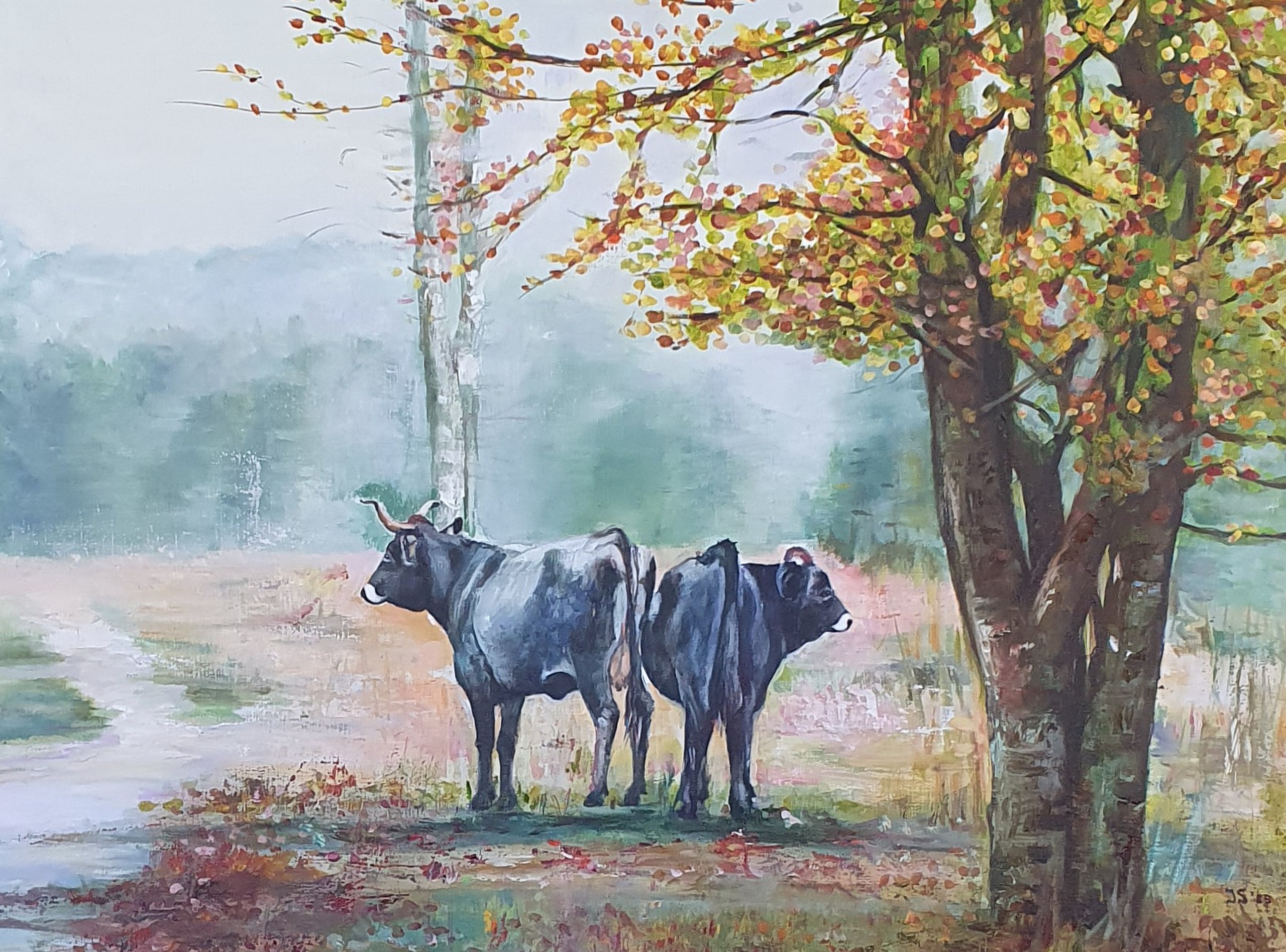 Spaanse runderen op de planken wambuis, naar een foto van Floris Scheerder. De sfeer van de runderen in de vroege ochtend mist sprak mij erg aan... Floris bedankt.