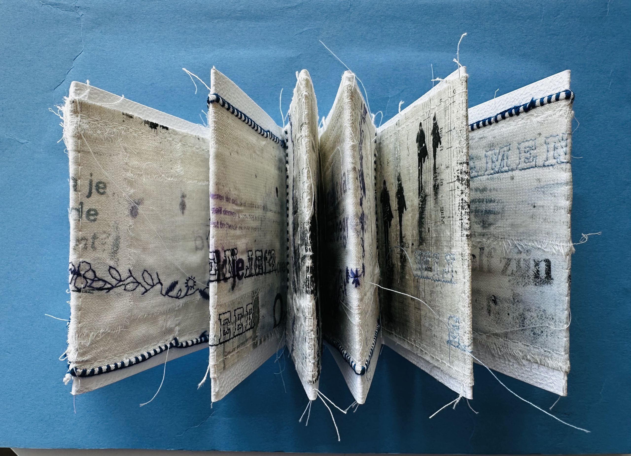 Leporello in doosje, op papier, genaaid, collagetechniek, van vintage servet, garen, printtechniek.