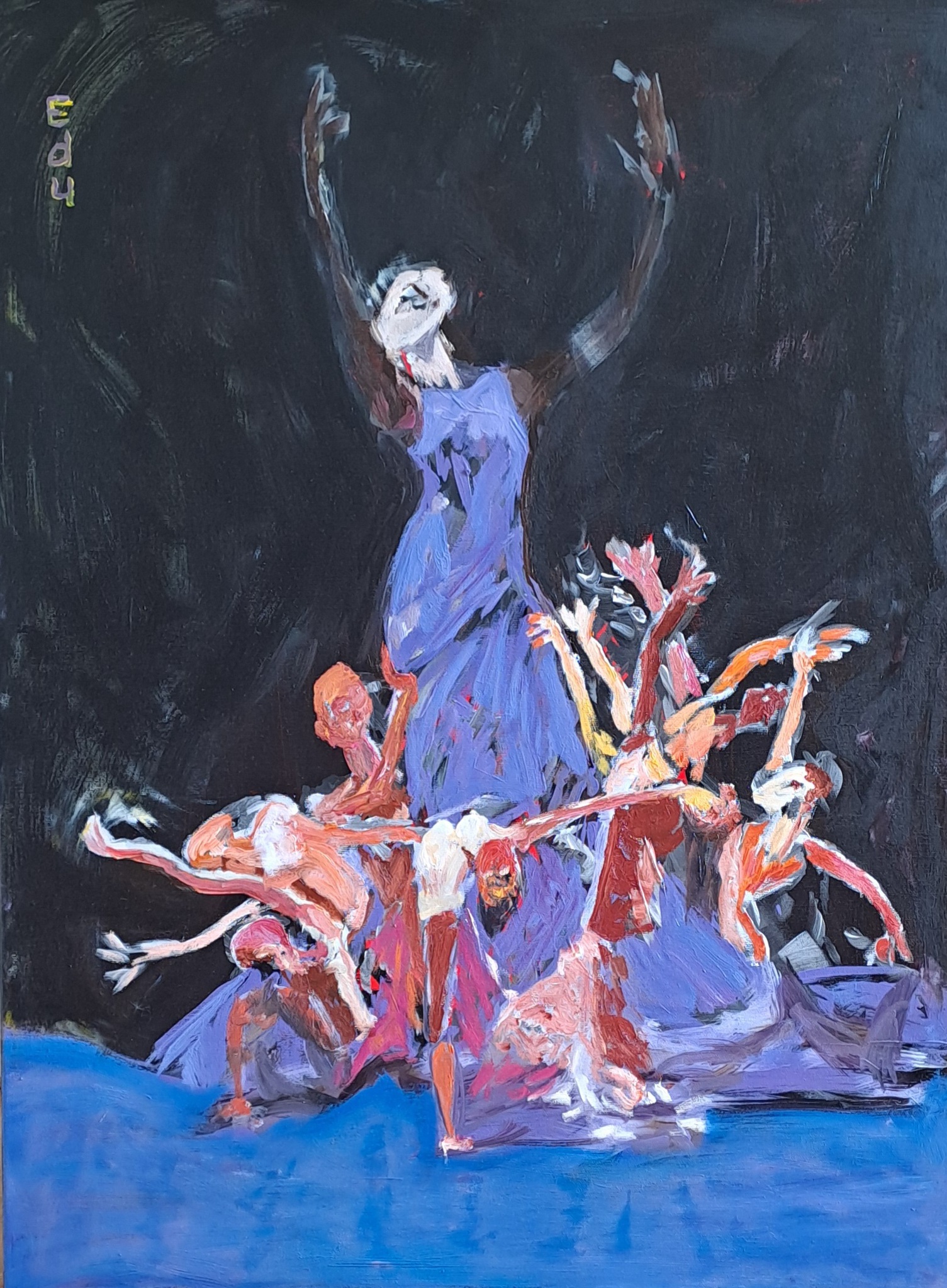 De huidige Edu schildert met waterbased olieverf op canvas, kenmerkend zijn de felle kleuren en de verstilde beweging.