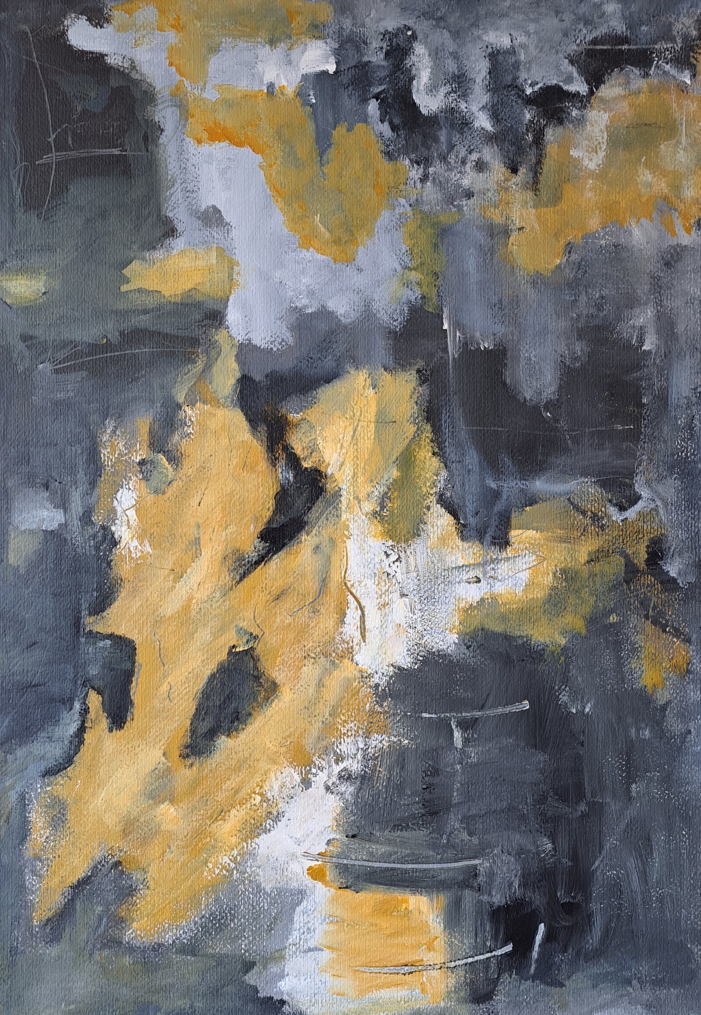 Een figuur duikt op uit de duisternis — abstract en vaag, maar herkenbaar door de houding en contrasten. Het lijkt alsof de figuur naar voren treedt uit een mist of rook, als een schim of geestverschijning. Een torso die licht gevangen wordt in het geel en wit, omringd door een zwaardere, donkere omgeving. Het werk geeft een gevoel van transformatie of openbaring.