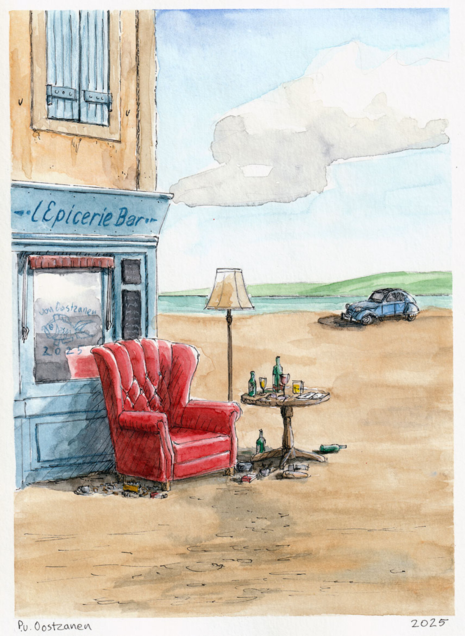 De foto toont een verlaten strand met een mysterieuze sfeer, waar een rood fluwelen stoel en een tafeltje met lege flessen en glazen staan alsof ze wachten op een verloren gast. Een oude blauwe citroën 2cv is geparkeerd bij de vloedlijn, terwijl groene heuvels de horizon sieren. Links staat een gebouw met een bord "L'Epicerie Bar" en een raam waarop een vis te zien is. Het roept een tijdloos en nostalgisch gevoel op. De compositie ademt een verhaal van vergane tijden, een stille scène vol verborgen betekenissen.