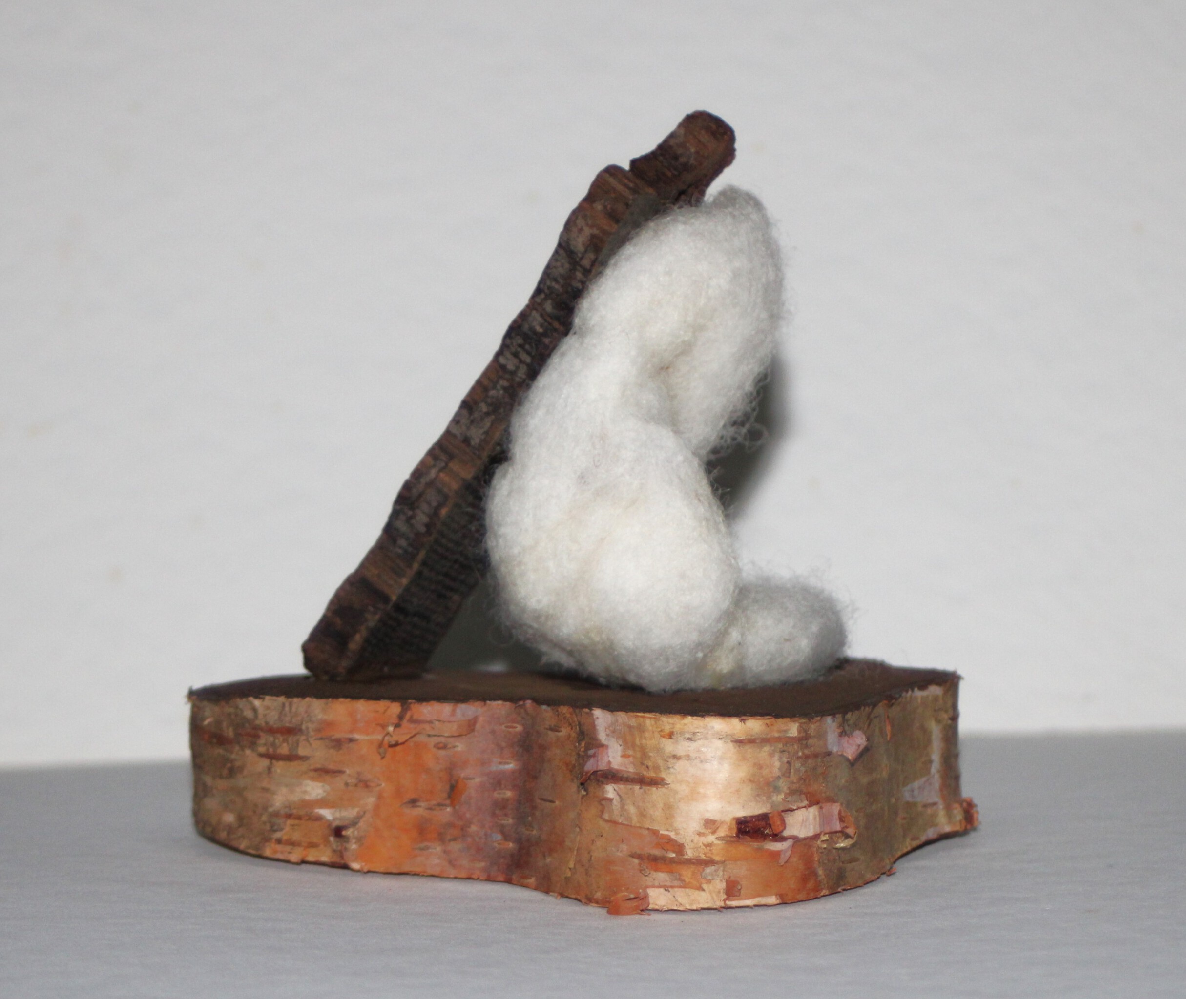 Wol, berkenhout; zachte, vergankelijke materialen. Archeologisch hout: put uit de ijzertijd, zo’n 3000 jaar oud. Steeds omsloten door grondwater en vochtige aarde, ingeklonken en verhard. Zacht en vergankelijk vilt en berkenhout, een sterk contrast met het archeologische hout. Qua kleur, hardheid en leeftijd. Maar toch dragen ze elkaar, leunen en steunen op elkaar, zonder het één blijft het ander niet overeind. De som is meer dan de losse delen. Ik tracht met mijn beelden te verwijzen naar de dubbele laag: de geschiedenis die het materiaal in zich bergt, de dingen die niet zichtbaar maar wel voelbaar aanwezig zijn.