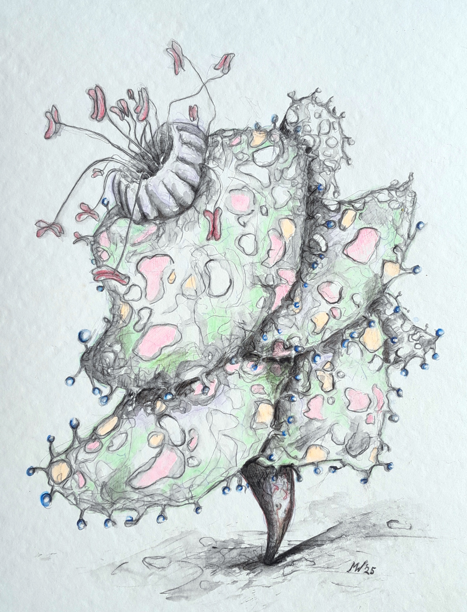 De titel van de dichtbundel "Les Fleurs du Mal" uit 1857 van de Franse dichter Charles Baudelaire inspireerde mij tot deze serie "kwaadaardige bloemen". De tegenstelling spreekt mij aan. (Aquarel-)potlood en water op 300 grams aquarelpapier.