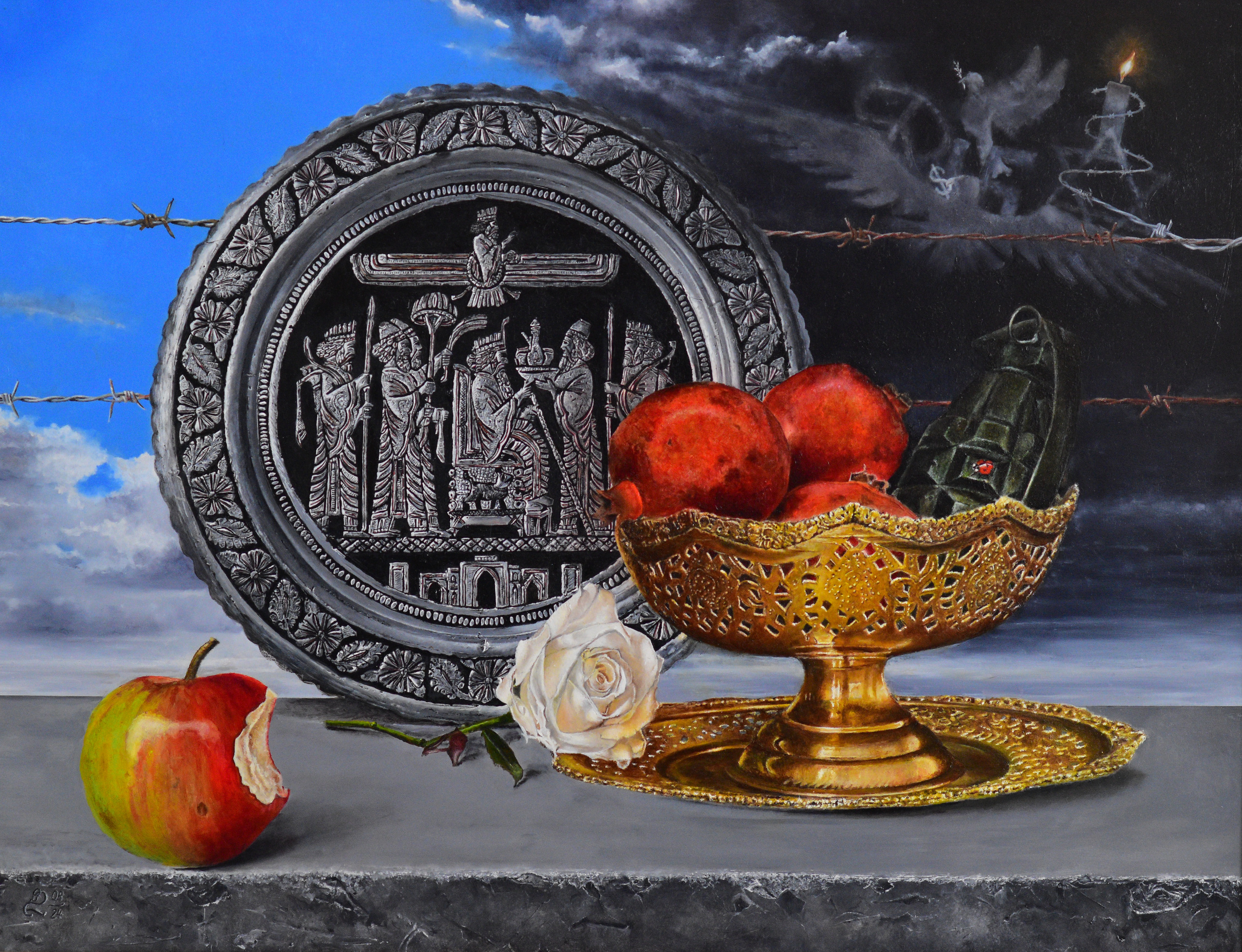 De basis van dit paneel is het bord dat ik kreeg van een Iraanse kunstenares met daarbij de volgende uitleg: Op het bord is een afbeelding te zien van Cyrus de GroteIn 539 v.Chr. werd de stad Babylon veroverd door de legers van Cyrus de Grote, de eerste koning van het oude Perzië (nu Iran). Maar niet zozeer deze verovering, maar vooral wat hij daarna deed, werd een belangrijke stap vooruit voor de Mensheid. Cyrus de Grote liet alle slaven vrij, verklaarde dat iedereen het recht had zijn eigen religie te kiezen, en bepaalde dat er rassengelijkheid moest zijn. Deze en andere decreten werden in Akkadisch schrift vastgelegd op een cilinder van gebakken klei. Deze oude stenen rol, die tegenwoordig bekend staat als de Cyrus Cilinder, wordt nu beschouwd als ’s werelds eerste handvest voor de mensenrechten. Het is in alle zes officiële talen van de Verenigde Naties vertaald en de inhoud ervan komt overeen met de eerste vier artikelen in de Universele Verklaring van de Rechten vande Mens. Veel mensen in Iran hebben een dergelijke afbeelding in huis als stil protest tegen het huidige regime.
