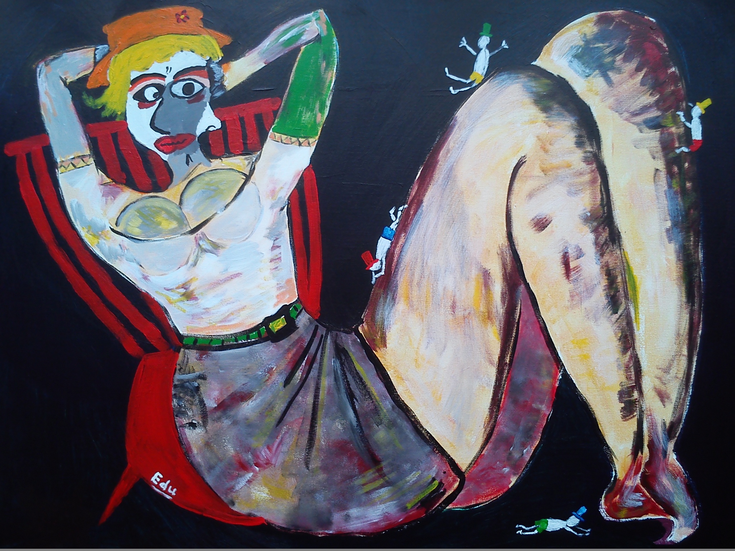 De huidige Edu schildert met waterbased olieverf op canvas, kenmerkend zijn de felle kleuren en de verstilde beweging.