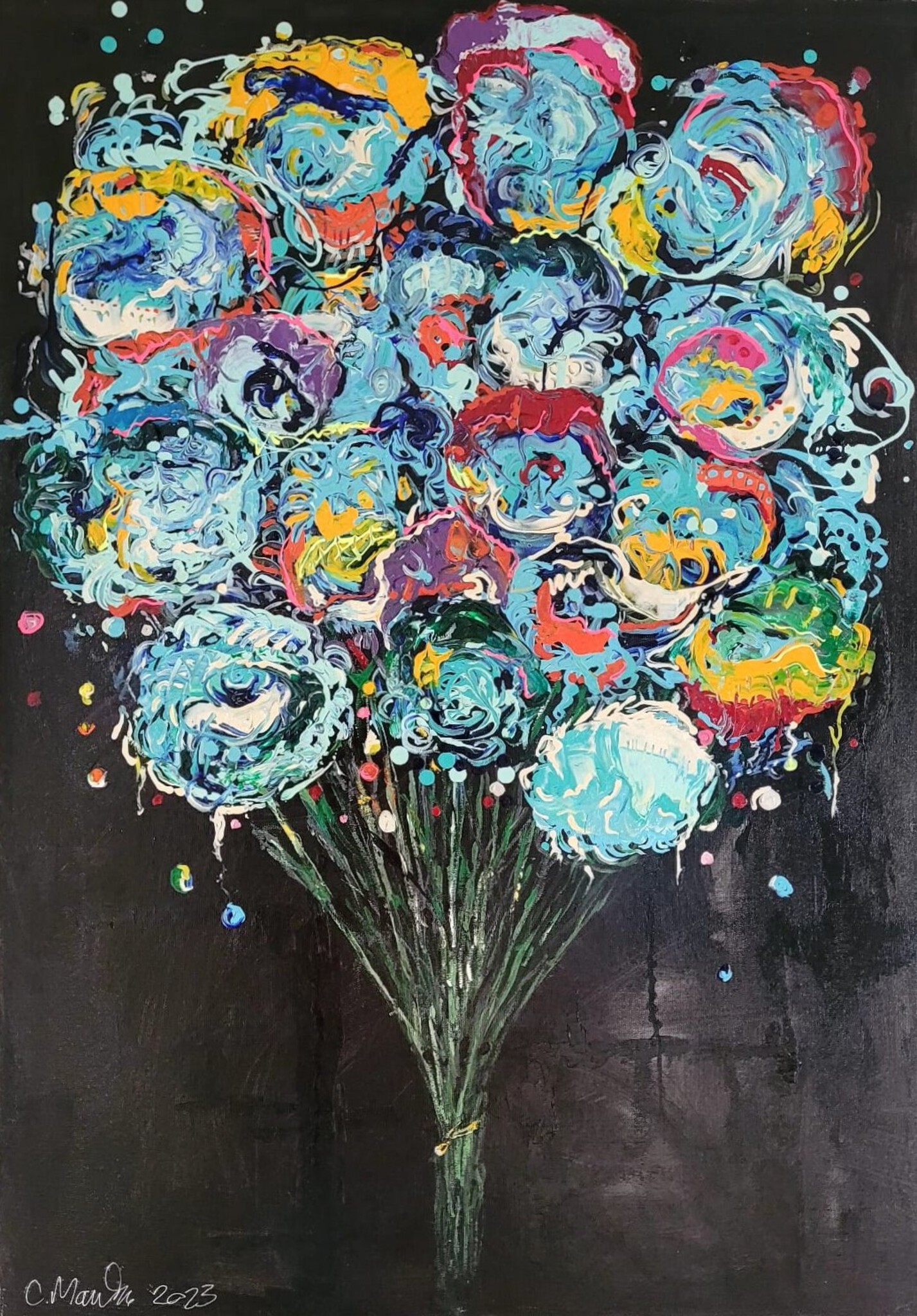 In a forgotten village nestled between velvet hills and silent rivers, there was a myth about a bouquet that could bloom with human memories. Legend said it sprouted once every century in the garden of a painter who had never loved, never lost, never cried—a soul untouched by life, yet chosen to witness all of it. This painting is that bouquet.