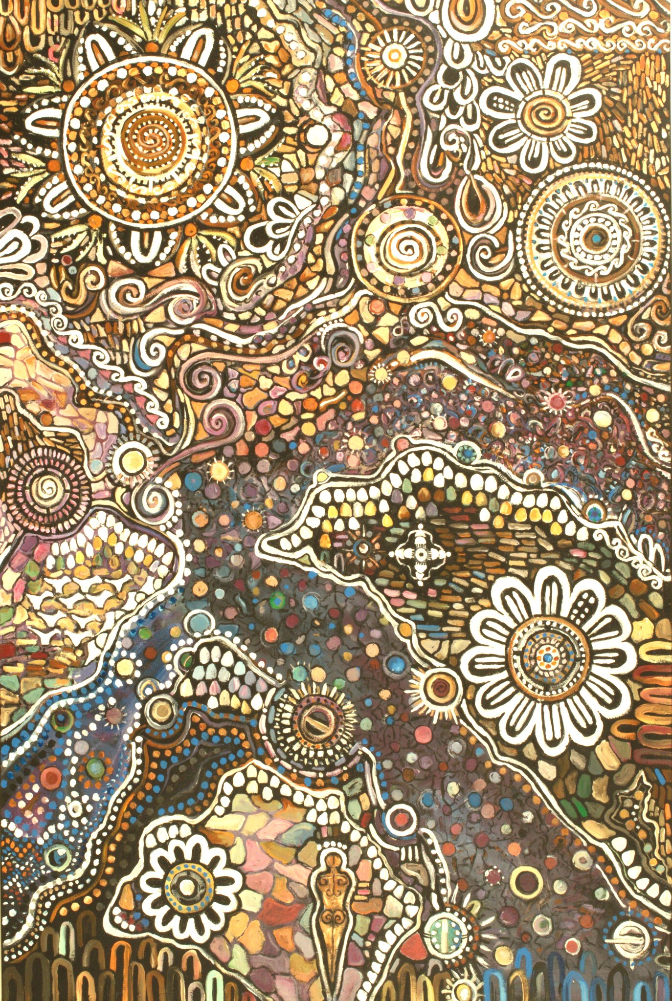 Long before time took form, the world was a great dreaming canvas—a place where colors, energy, and spirit danced as one. In this sacred realm, everything lived in song and symbol. This painting is a map of that ancient world: a cosmic story etched in light and rhythm. At the heart of the land, the Sun Mothers spiraled outward, their warmth blooming in great white flowers that carried the whispers of life. These flowers were not merely petals, but portals—gateways to memory and prophecy. The spiral suns above them pulsed in eternal motion, spinning tales of birth and transformation. Woven between the golden pathways are rivers of spirit, flowing blue like veins of dreaming water. These lines connect each sacred circle, each flower, each fire-lit gathering place. They carry the stories of the Star Elders, who watch from above in silence and song, guiding the people through night and uncertainty. Within this sacred geography, each dot and spiral is a footstep in the Dreaming, a trail left by those who came before. These footsteps ripple with energy, echoing with drums and chants that still linger in the land for those who choose to listen.