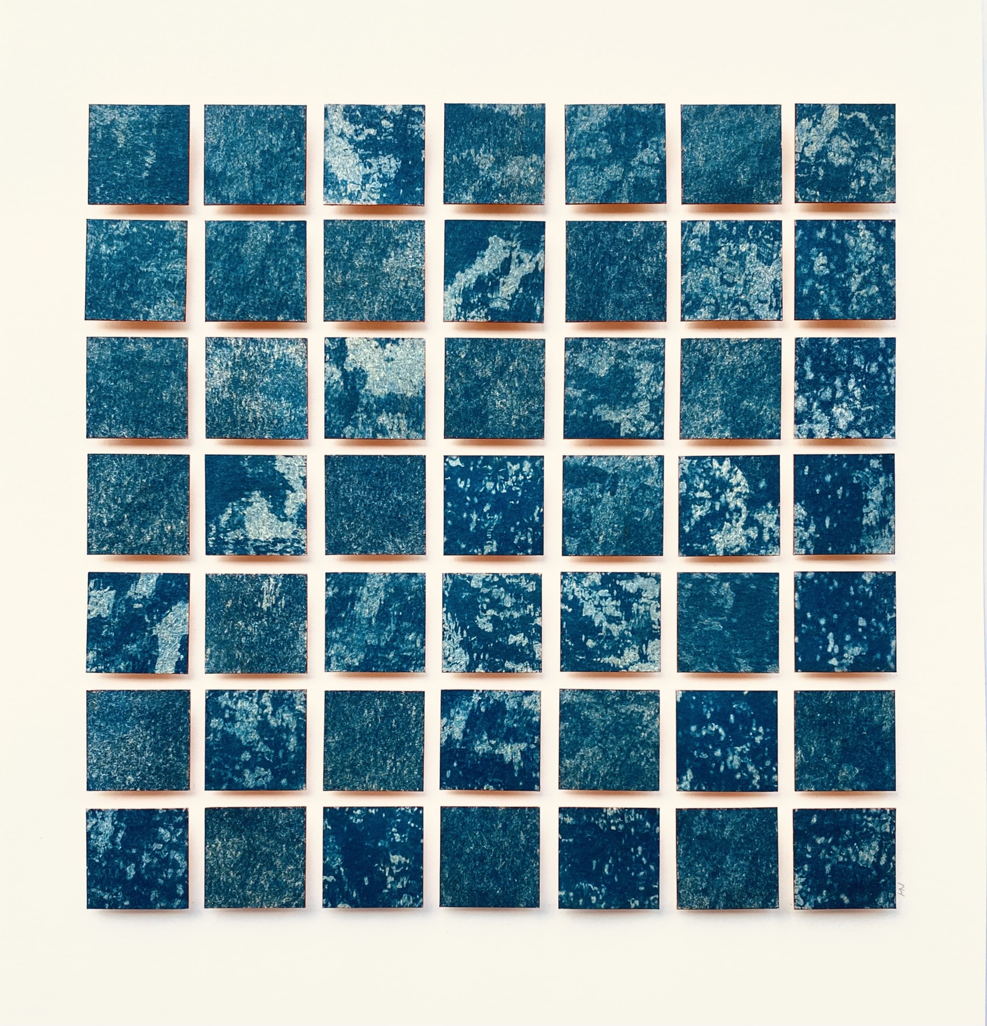Uit de serie _wiederblau -höhen und tiefen. Abstracte Cyanotypie, gecombineerd met foto’s. Aquarelpapier op gekleurde houten blokjes. Prijs inclusief passe partout en Nielsen wissellijst (kleur eikenhout) afmeting 40x40 cm. Blauwdruk oftewel cyanotypie is een van de oudste fotografische technieken uit omstreeks 1840. Het proces ontstaat bij het mengen van twee chemicaliën (Ammoniumijzercitraat en Kaliumhexacyanoferaat) Als deze twee stoffen worden blootgesteld aan zonlicht veranderen ze in Berlijns Blauw. Wanneer de chemicaliën zijn weggespoeld met water blijft er de kenmerkende blauwe kleur achter, waarop de afbeelding in witte lijnen is weergegeven.
