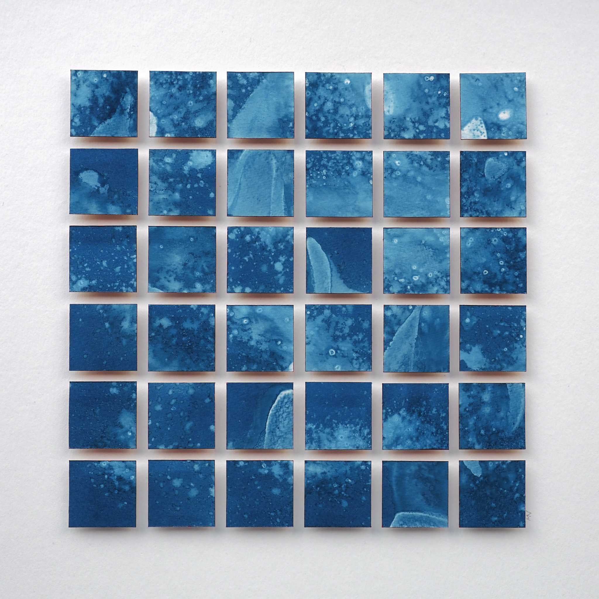 Uit de serie _wiederblau -höhen und tiefen. Abstracte Cyanotypie, gecombineerd met foto’s. Aquarelpapier op gekleurde houten blokjes. Prijs inclusief passe partout en Nielsen wissellijst (kleur eikenhout) afmeting 50x50 cm. Blauwdruk oftewel cyanotypie is een van de oudste fotografische technieken uit omstreeks 1840. Het proces ontstaat bij het mengen van twee chemicaliën (Ammoniumijzercitraat en Kaliumhexacyanoferaat) Als deze twee stoffen worden blootgesteld aan zonlicht veranderen ze in Berlijns Blauw. Wanneer de chemicaliën zijn weggespoeld met water blijft er de kenmerkende blauwe kleur achter, waarop de afbeelding in witte lijnen is weergegeven.