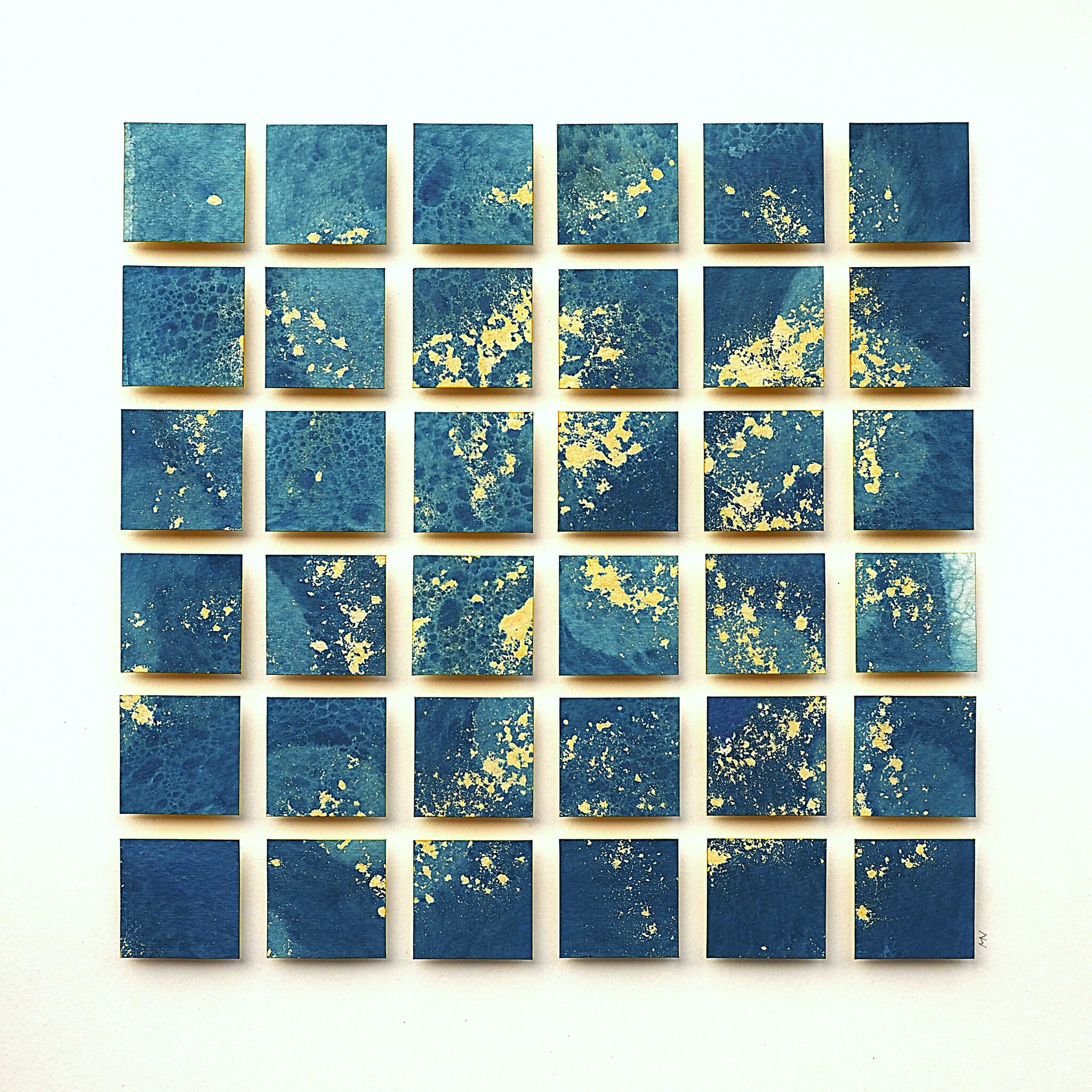 Uit de serie _wiederblau -höhen und tiefen. Abstracte Cyanotypie, gecombineerd met foto’s. Aquarelpapier op gekleurde houten blokjes. Prijs inclusief passe partout en Nielsen wissellijst (kleur eikenhout) afmeting 50x50 cm. Blauwdruk oftewel cyanotypie is een van de oudste fotografische technieken uit omstreeks 1840. Het proces ontstaat bij het mengen van twee chemicaliën (Ammoniumijzercitraat en Kaliumhexacyanoferaat) Als deze twee stoffen worden blootgesteld aan zonlicht veranderen ze in Berlijns Blauw. Wanneer de chemicaliën zijn weggespoeld met water blijft er de kenmerkende blauwe kleur achter, waarop de afbeelding in witte lijnen is weergegeven.