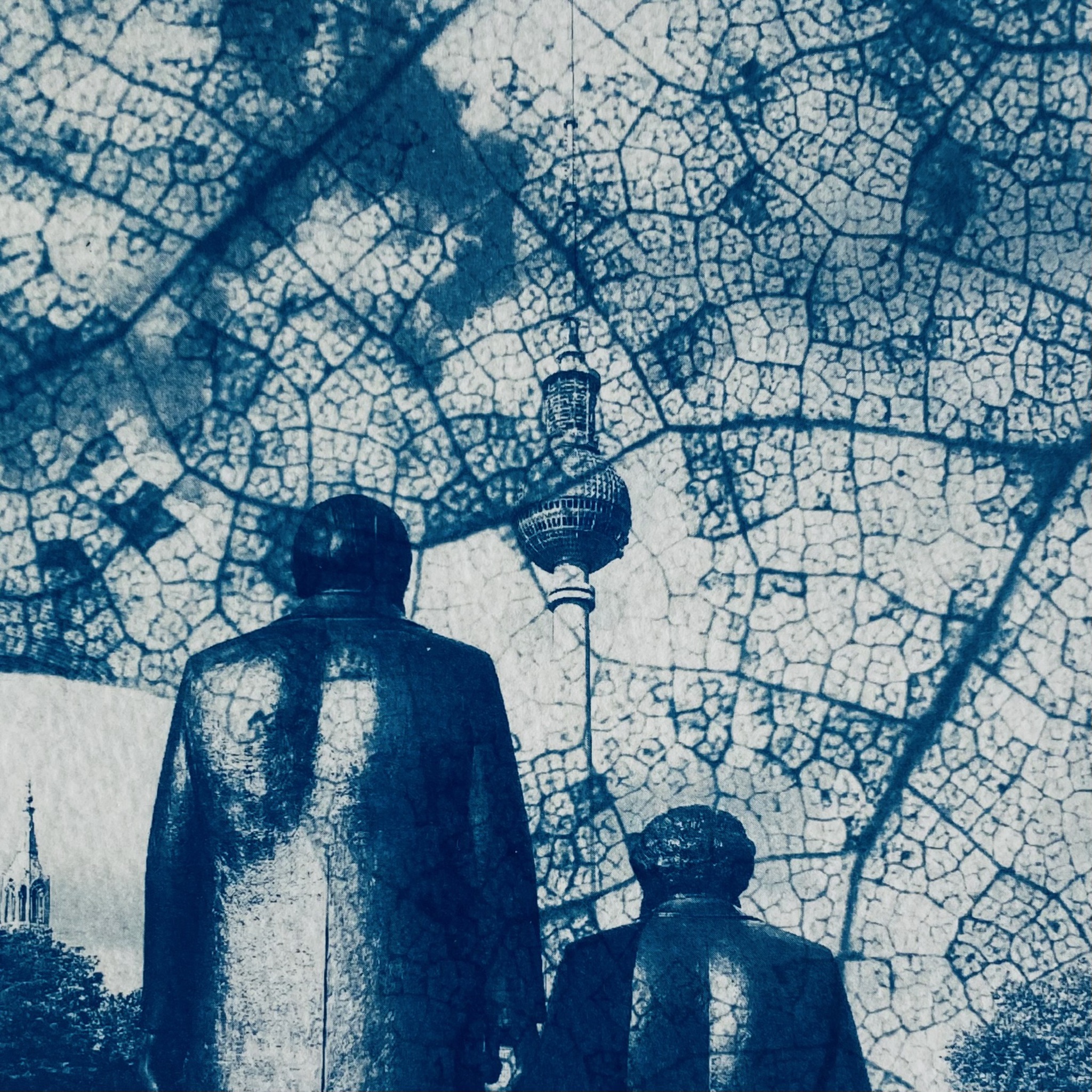 Uit de serie dubbel belichte fotogrammen. Op 300 grams aquarelpapier. Onder het motto: -geschiedenis draag je mee-versmelten Marx en Engels op de voor- of achtergrond met het heden. Blauwdruk oftewel cyanotypie is een van de oudste fotografische technieken uit omstreeks 1840. Het proces ontstaat bij het mengen van twee chemicaliën (Ammoniumijzercitraat en Kaliumhexacyanoferaat) Als deze twee stoffen worden blootgesteld aan zonlicht veranderen ze in Berlijns Blauw. Wanneer de chemicaliën zijn weggespoeld met water blijft er de kenmerkende blauwe kleur achter, waarop de afbeelding in witte lijnen is weergegeven.