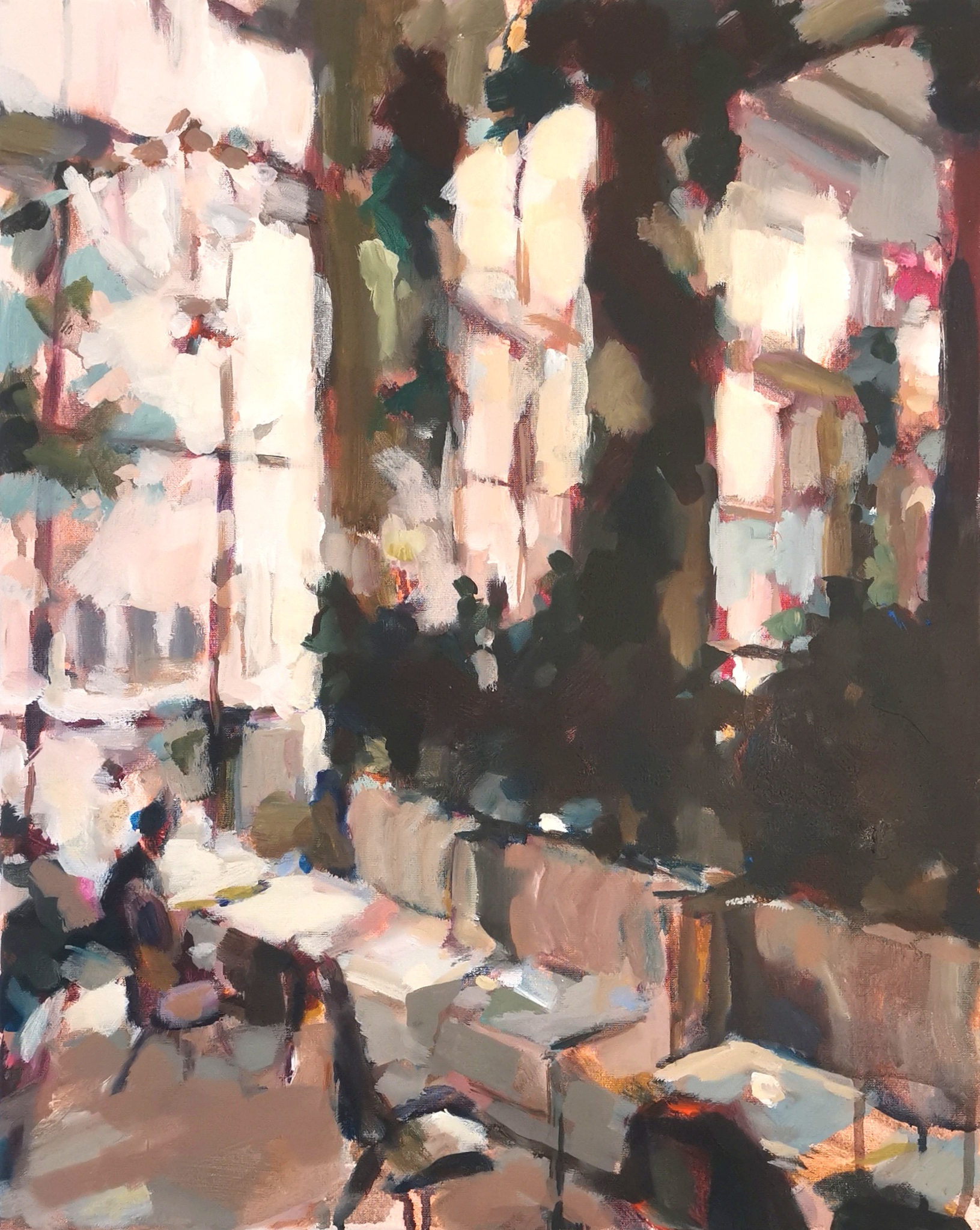 Van binnen naar buiten kijken staat centraal. Daarbij een focus op het verkennen van de diepte van kleur en de kunst van het expressief vastleggen van licht op doek.