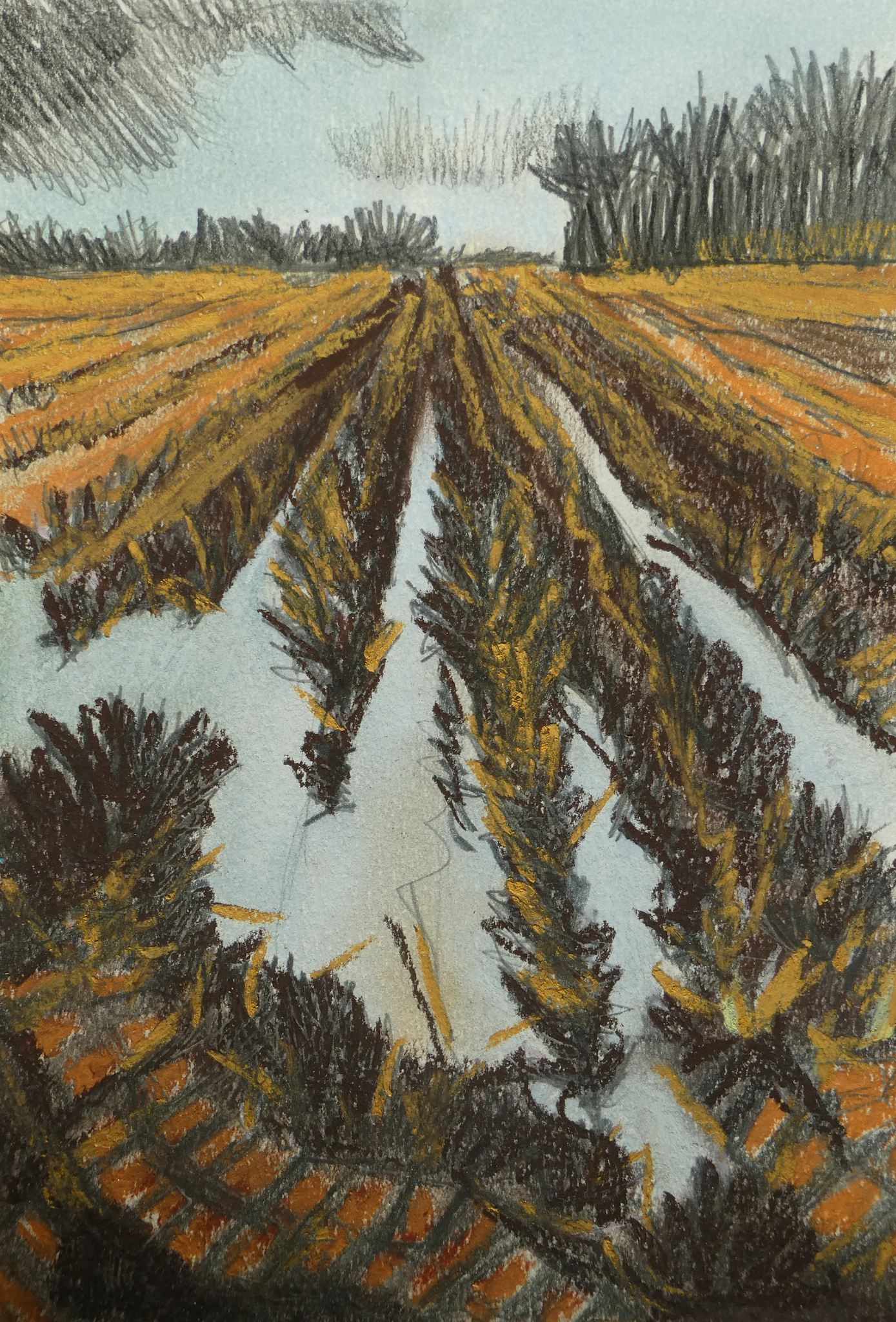 Na veel regenval staat het land voor een groot deel onder water. In pastelkrijt op papier.