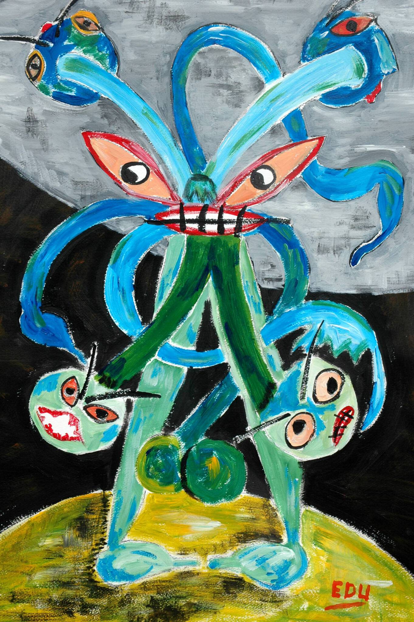 De huidige Edu schildert met waterbased olieverf op canvas, kenmerkend zijn de felle kleuren en de verstilde beweging.