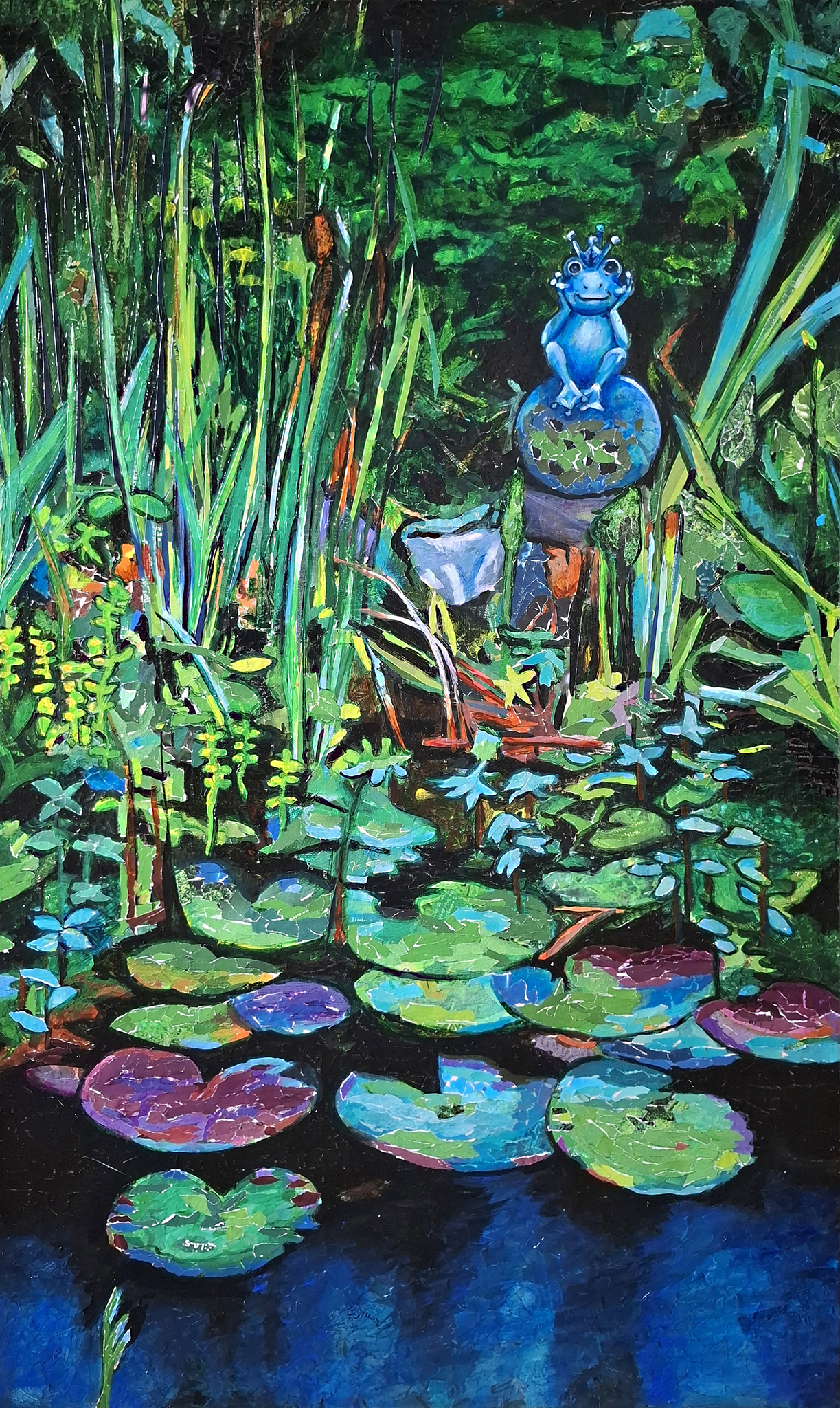 Middendoek van een drieluik. Papiersnippers en acrylverf op doek. Inspiratieplek: mijn eigen vijver. Het drieluik is alleen in zijn geheel te koop.