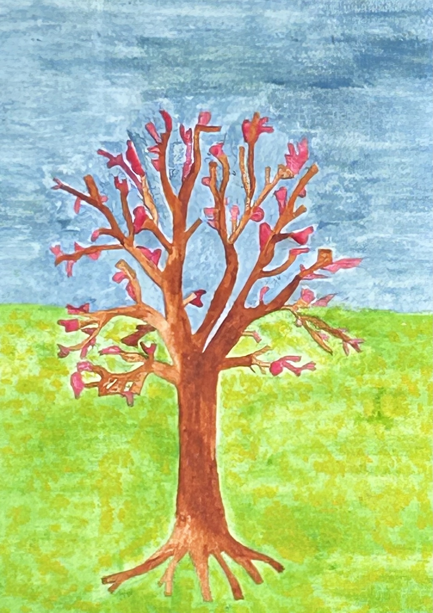 Een boom waar de bloesem net begint te groeien, zoals in het voorjaar, met bloemen en gras eromheen.