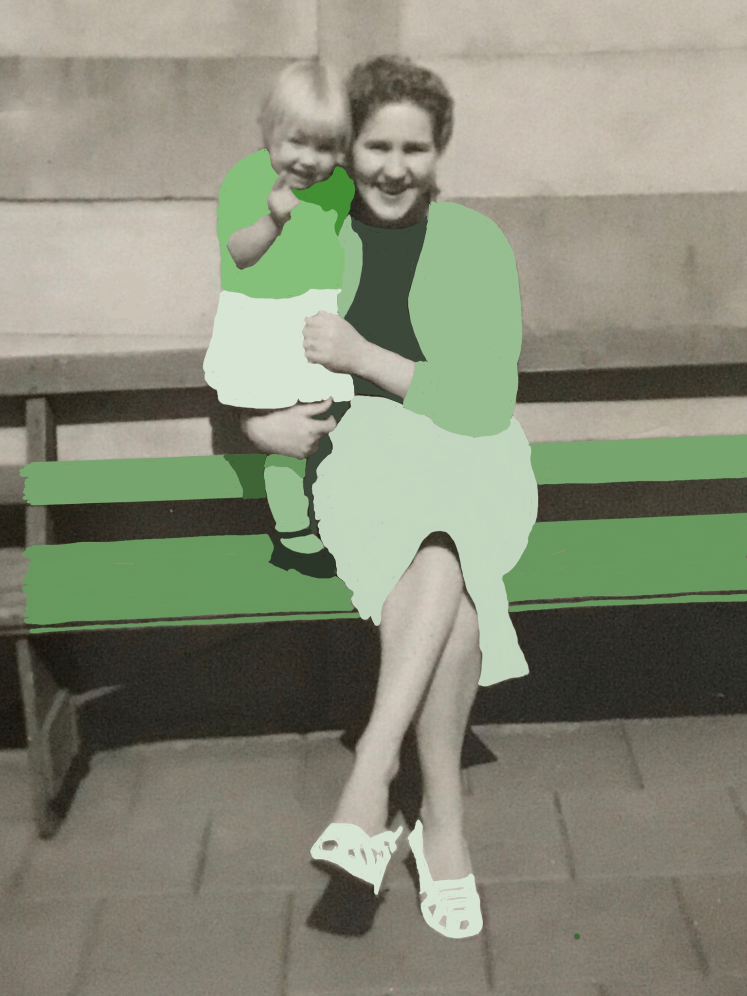 Moeder Mama Vroeger Jeugd Kleding Meisje Groen Grijs Wit Bankje Schoenen Rok