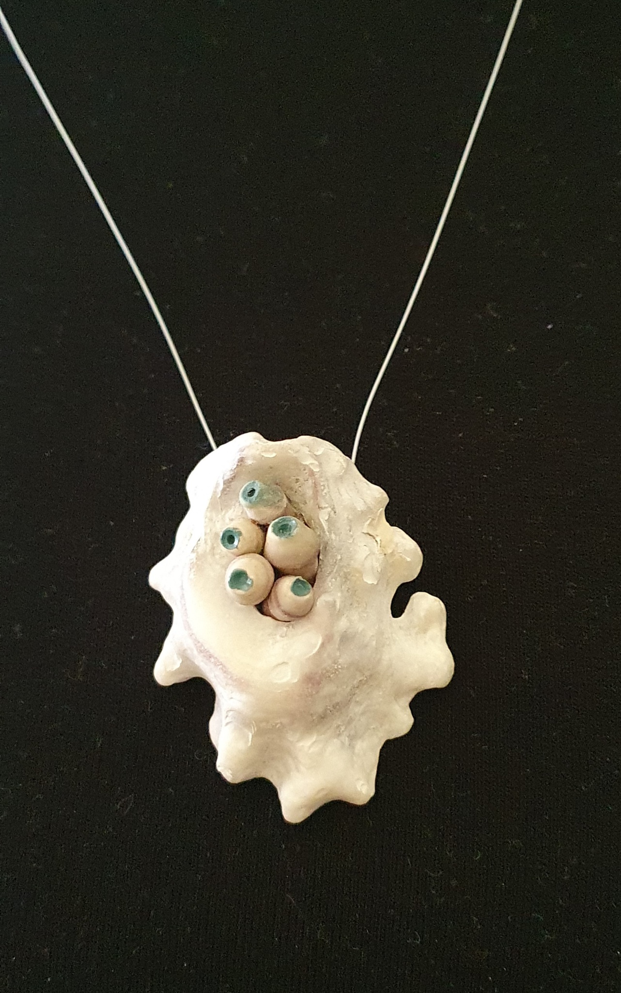 Bij een oesterput zoeken we uitgebreid naar kleine schelpen met een gat. De gebruikelijke grote schelpen zijn heel lastig te bewerken. Zo'n afwijkende als deze is wat ons betreft perfect! Vanuit het gat piepen de aanhechtingskopjes van stekels van de diepzee-egel naar buiten, We accentueren het met een blauw accent van zegellak. Daarme zetten we ze ook vast. Voila: Yerseke's Glorie met een exotisch accent.