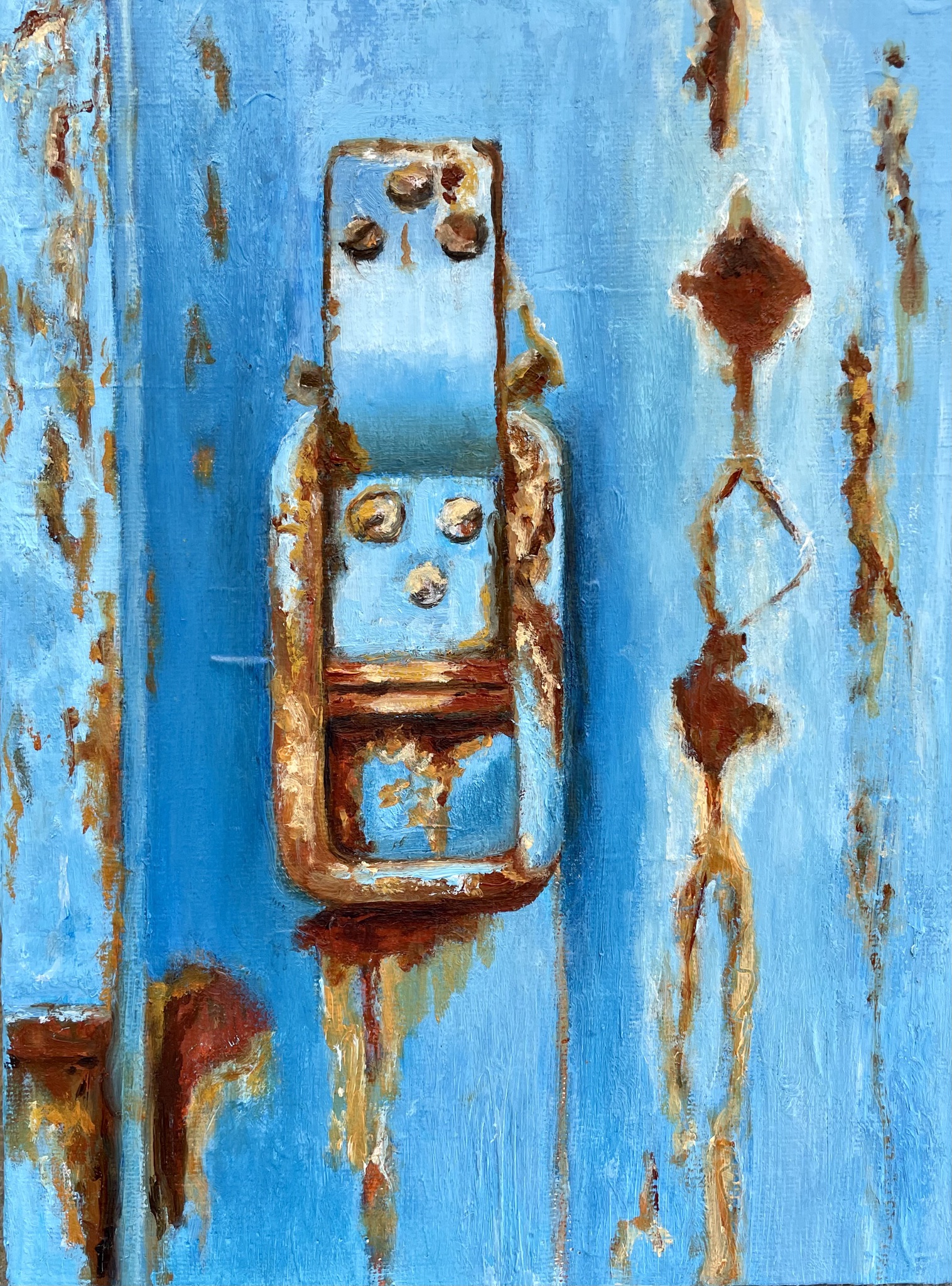 Een karakteristiek roestig slot vastgelegd met olieverf op doek.
