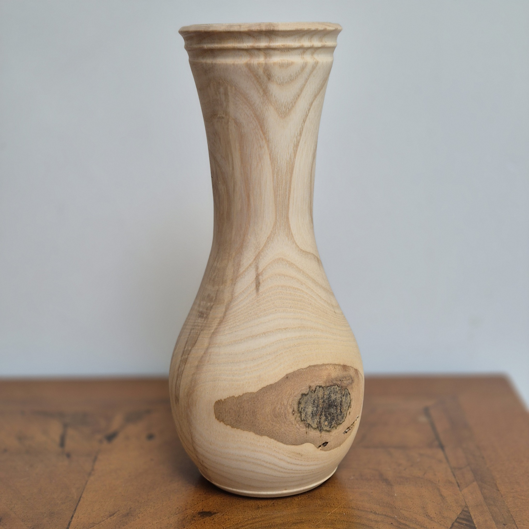 Essen, een lichte houtsoort met duidelijke nerven, en soms kom je tijdens het draaien een verrassing tegen: dan lopen de lijnen niet allemaal even recht.