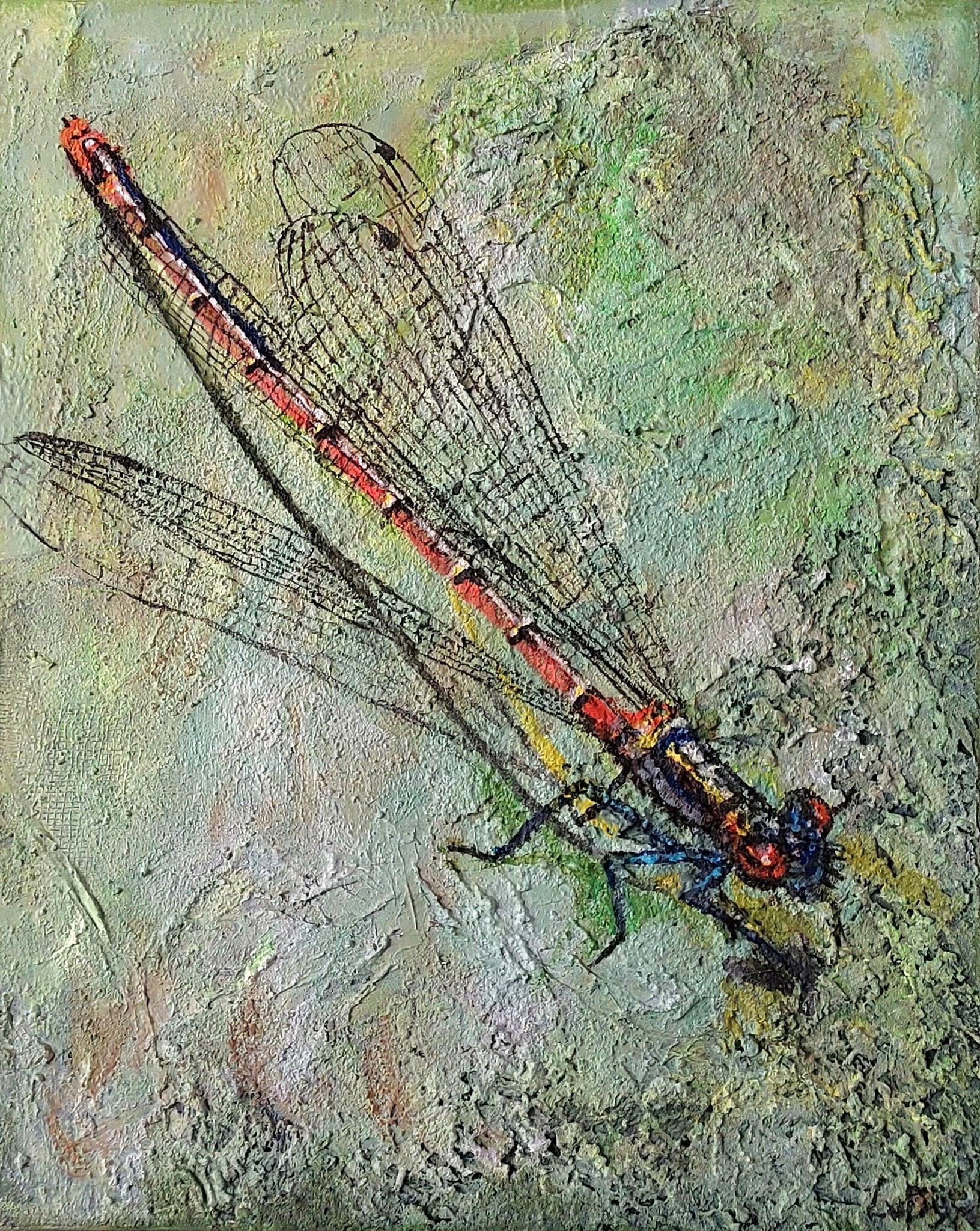Iets in de buitenwereld intrigeert mij en door deze impressie uit te werken wordt zij blijvend deel van mijn binnenwereld. Laag na laag bouw ik aan de uiteindelijke vorm. Tijdens het werken komt er een stroom van associaties op gang. Het is een constant zoeken naar evenwicht tussen de verf en de andere materialen.
