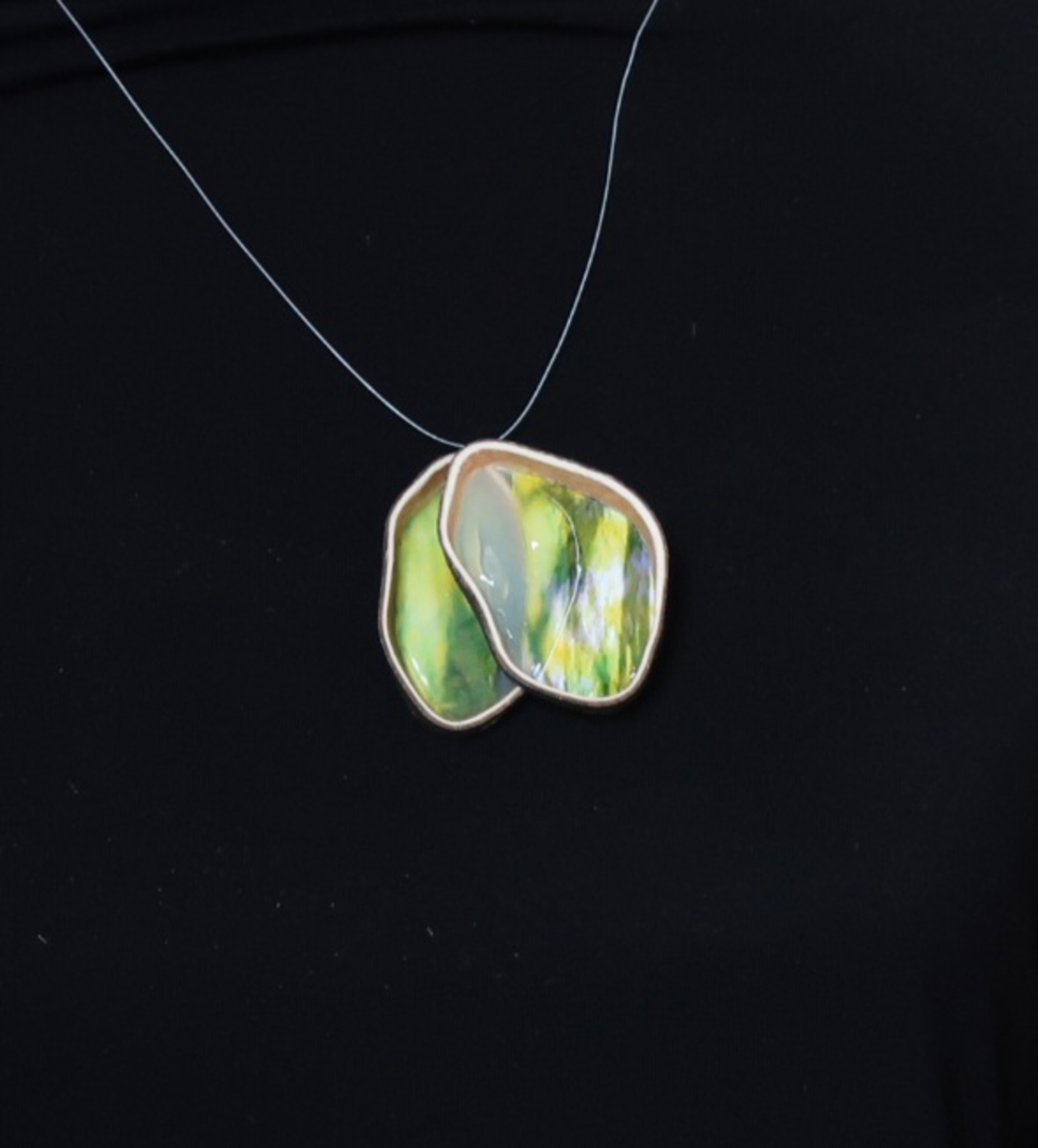 Wat is kelp, een gedroogde bruine algensoort, toch een veelzijdig materiaal. We hebben ze in fraaie organische ringen gezaagd. Zo vormen ze het kader voor een door Helena Hartholt gemaakte en bewerkte natuurfoto. De 2 ringen zijn zo samengevoegd dat als het sieraad gedragen wordt, de kleur van de kleding ook nog onderdeel van het sieraad wordt.