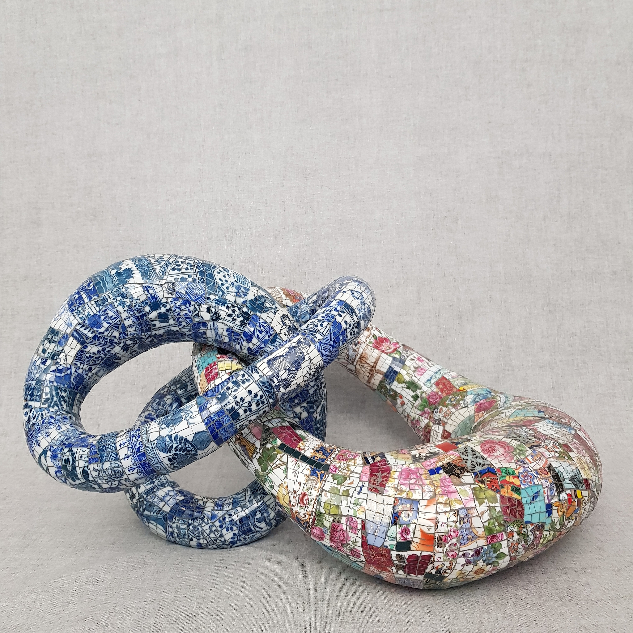 Nummer VIJF in de reeks van "Bont & Blauw " Aan elkaar gekoppeld tot èèn geheel. Incl. de DRIE porsleinen oortjes ( handtekening ) en de initialen WA. Volledig MET DE HAND gemaakt. Deze sculptuur is TE KOOP.