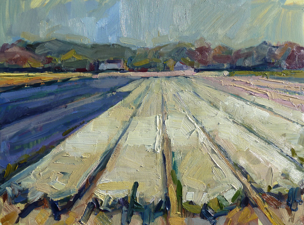 Wit bollenveld: "De geur van Hyacinthen" plein air geschilderd in de bollenstreek bij Egmond aan Zee.