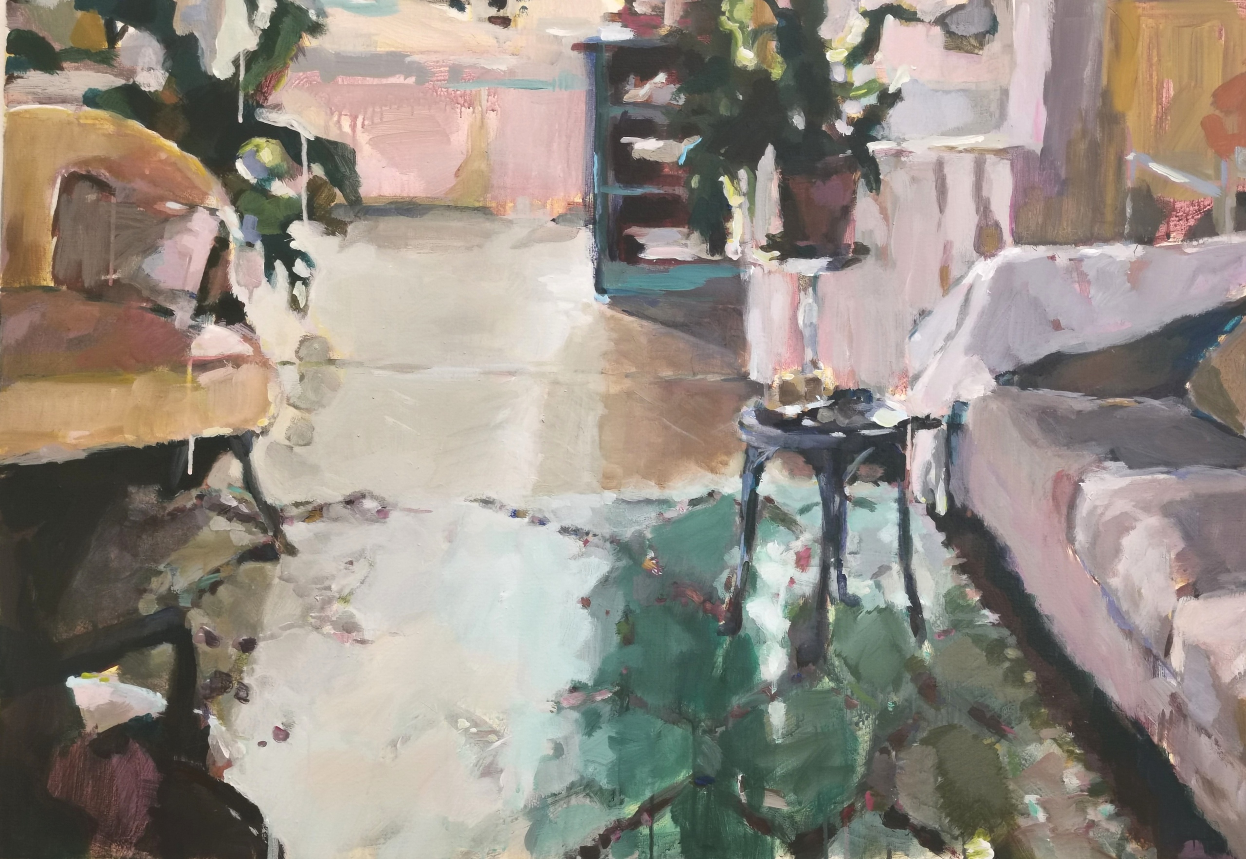 Van binnen naar buiten kijken staat centraal. Daarbij een focus op het verkennen van de diepte van kleur en de kunst van het expressief vastleggen van licht op doek.
