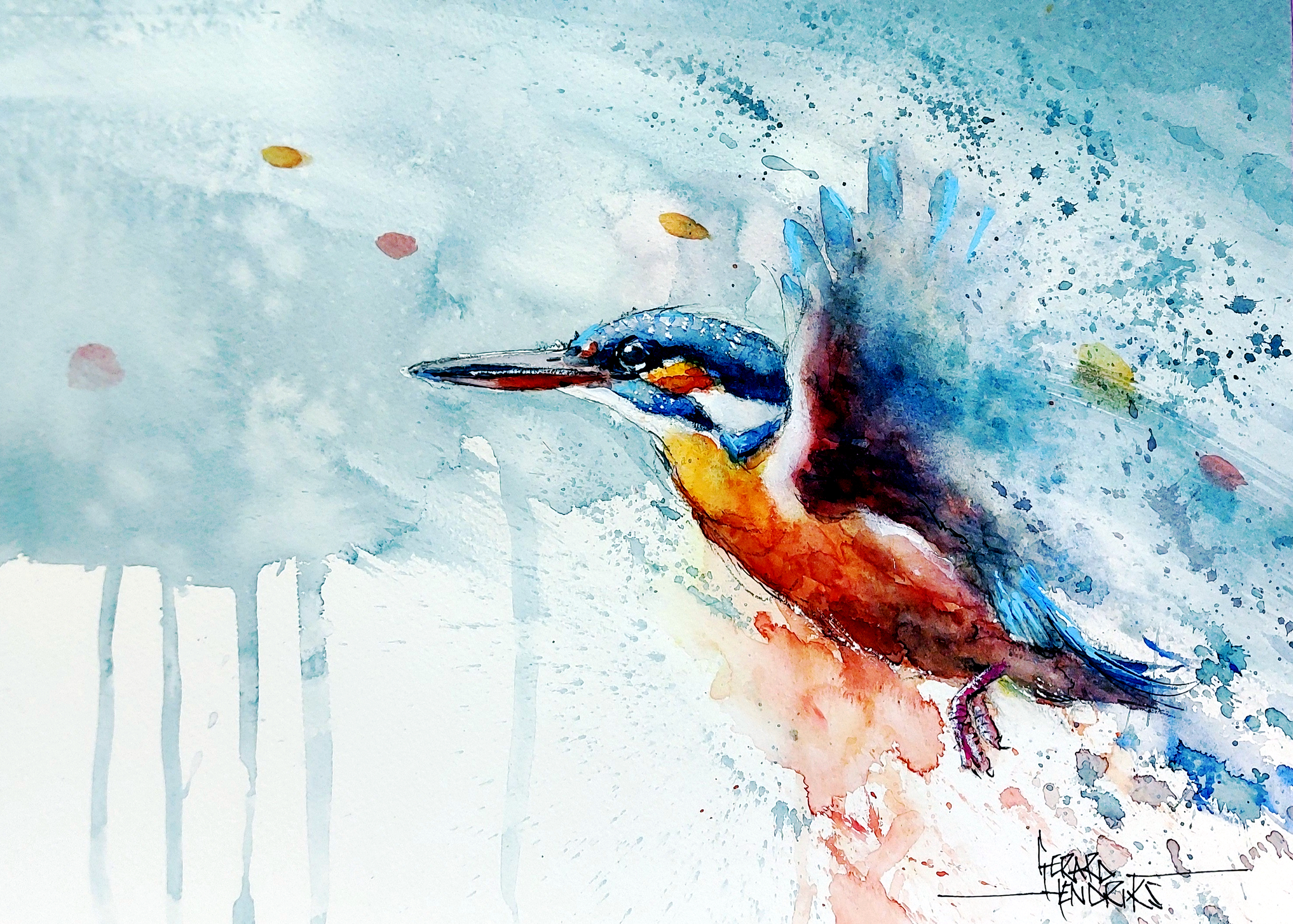 Zij schoot uit het kabbelende water omhoog, met losse penseelstreken kon ik haar vangen, een ijsvogel stralend blauw en oranje in het waterlicht. She shot up from the rippling water, with loose brushstrokes I was able to capture haer, a kingfisher radiant blue and orange in the water light.