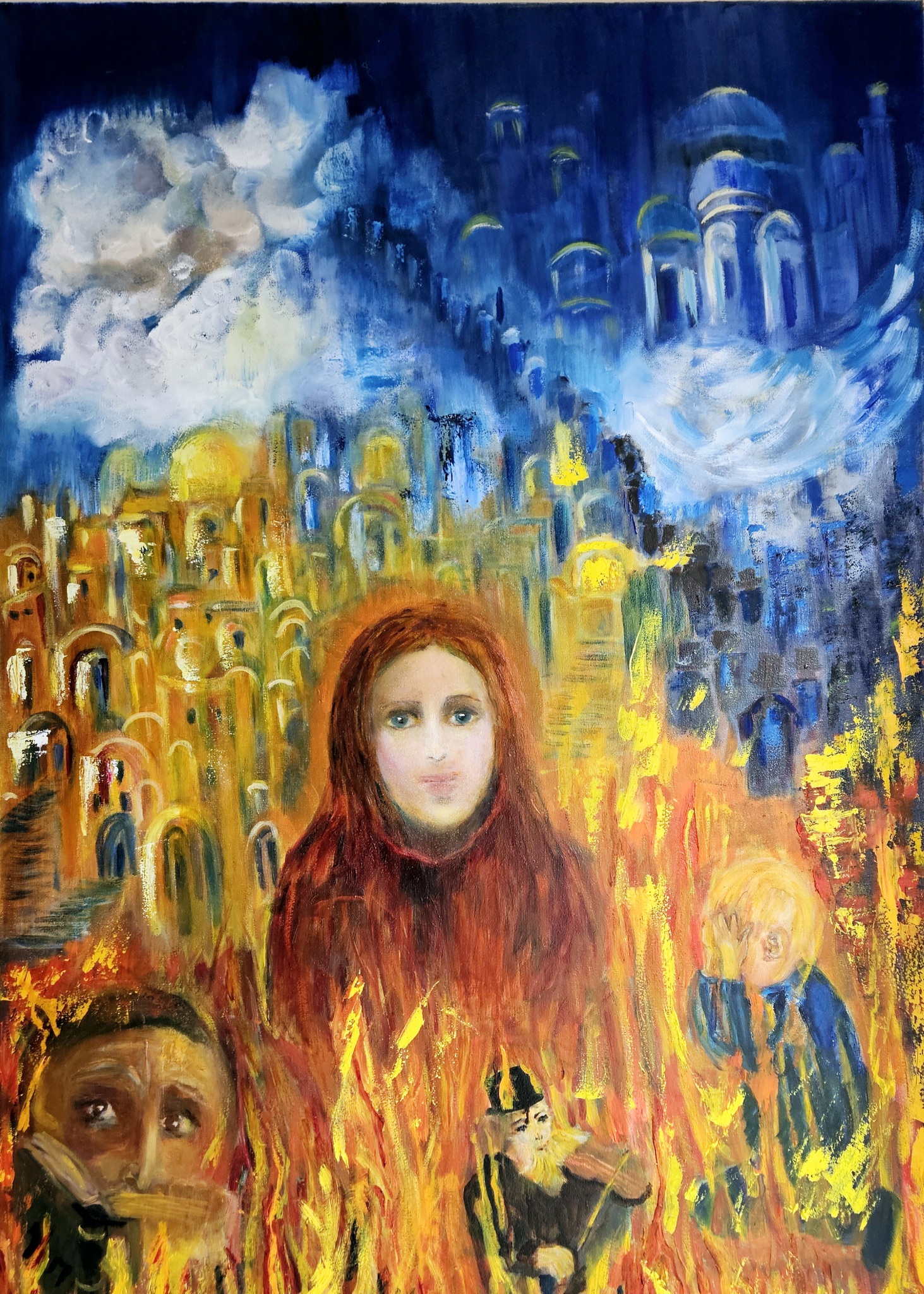 Deze schilderij toont een dramatische scène met vurige kleuren onderaan, figuren in het vuur, en een stad die overgaat van warme, gele tinten naar koele, hemelse blauwen bovenaan. Er lijkt een duidelijke tegenstelling te zijn tussen chaos/vernietigen, en een soort hemelse of spirituele stad bovenin het beeld. Iedereen heeft verschiellende voorsteling over deze hemelse stad... Tegenstelling tussen chaos en spiritualiteit, met de vrouw centraal als verbindende of lijdende figuur. Reflectie op de rol van de vrouw, met de spanning tussen aardse chaos en spirituele transcendentie.
