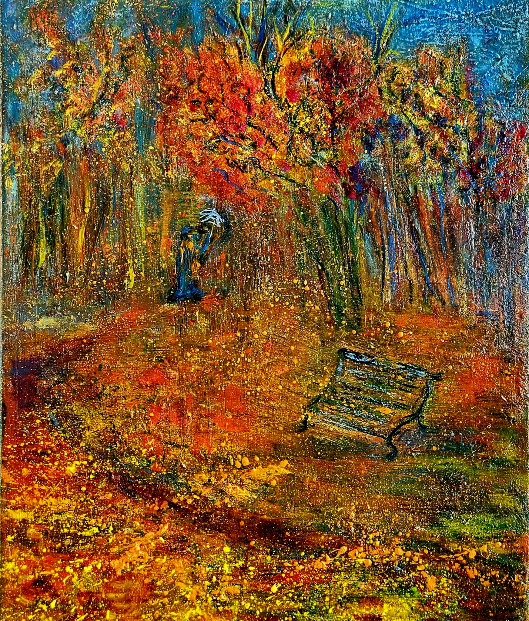 Deze schilderij toont een herfstachtig boslandschap met vurige, warme kleuren, een lege bank en een eenzame figuur onder de bomen. De sfeer is dromerig, reflectief en enigszins melancholisch, met een nadruk op vergankelijkheid en stilte.