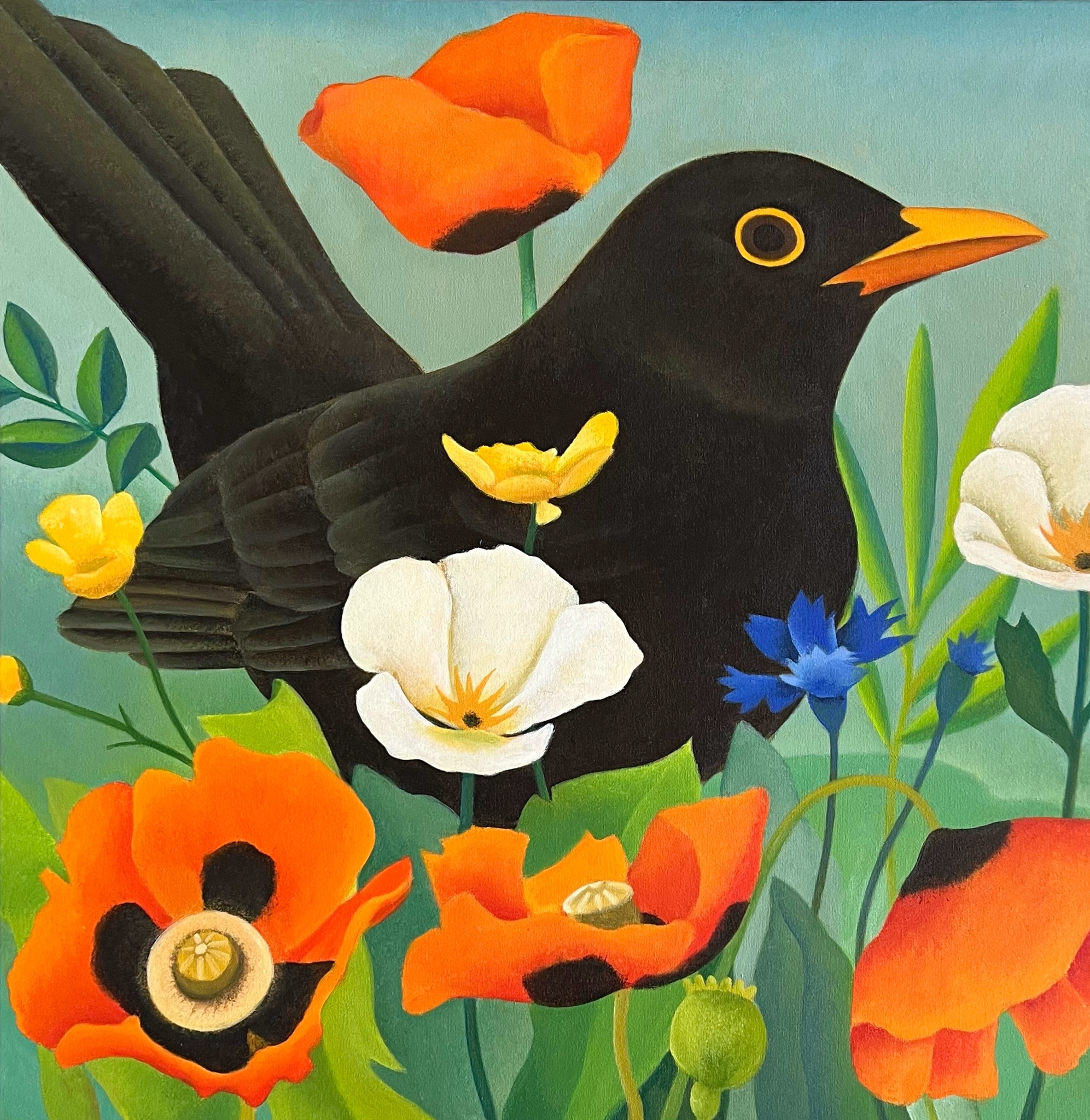 Merel Black Bird Vogel Veldbloemen Klaprozen Boterbloemen Bloemen Korenbloemen Gekleurde Bloemenweide