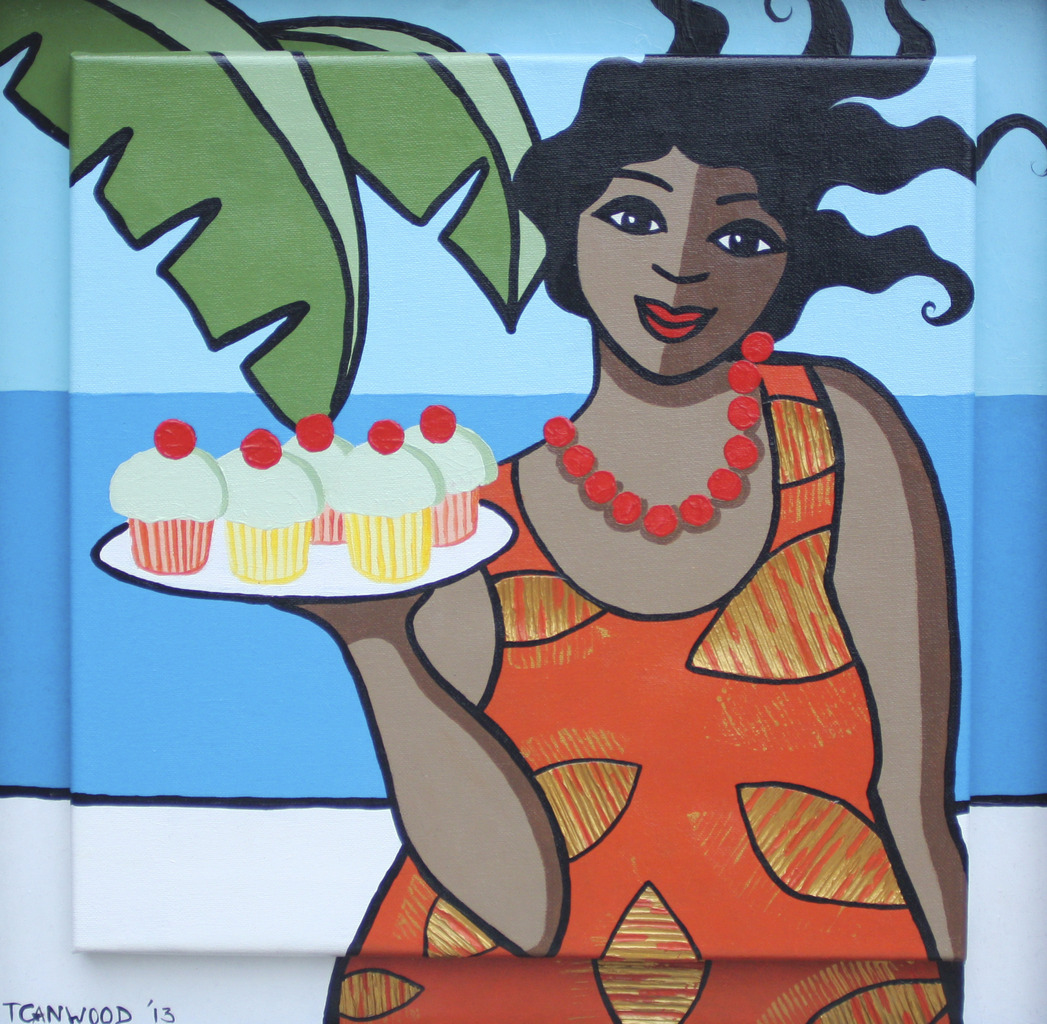 Dame aan een tropisch strand deelt cakejes uit. Dit is een met de hand bewerkte digitale print op doek en board (acryl, goudverf, golfkarton, stempel), er is maar 1 exemplaar van. De prijs is inclusief een zwarte houten baklijst. Dit werk is te huur voor voor 3% van de verkoopprijs per maand. Minimale huurtermijn is 1 jaar. 2% is spaartegoed voor aankoop van een kunstwerk.