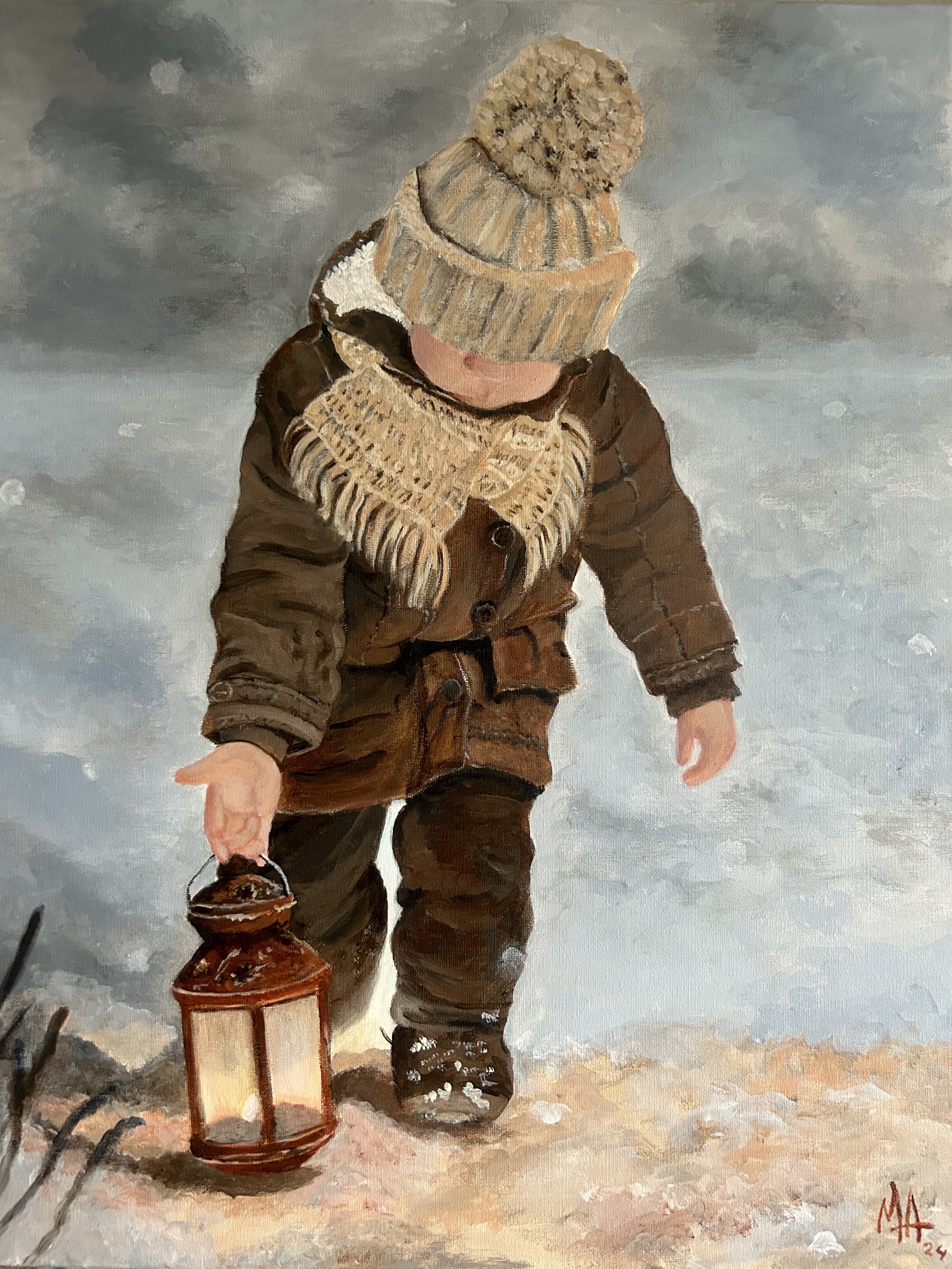 Winter in Russia. Eén van de vier werken uit de serie Kids & Season. Acrylverf op doek 40 x 50 cm.