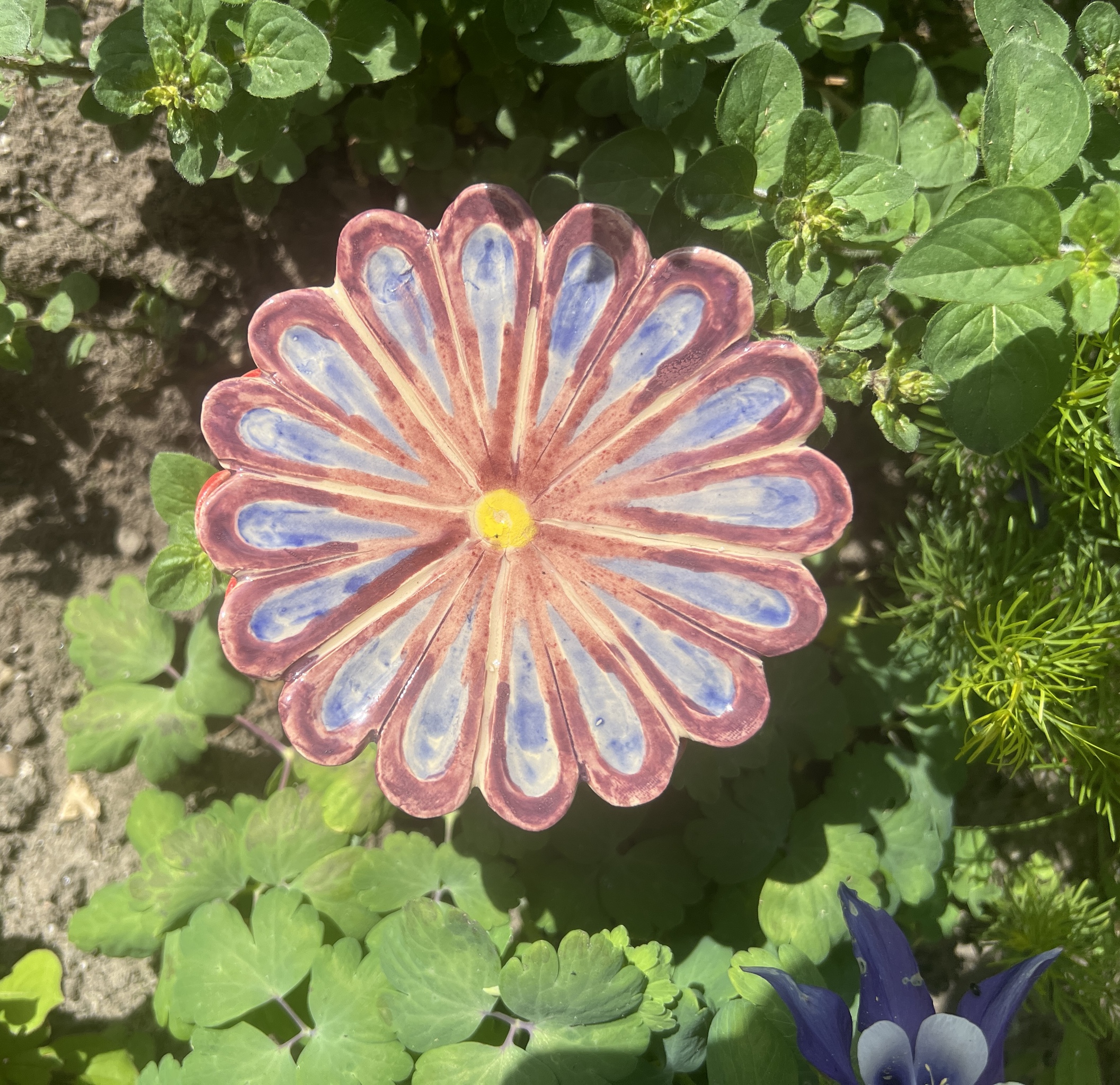 Waterschaaltje voor bijen en andere insecten. Bijen hebben water nodig om gekristalliseerde honing op te lossen en honing te verdunnen bij de productie van voedsel voor larven of om af te koelen. Ook andere insecten drinken graag water met warm weer en koelen graag af. Daarom zijn de schaaltjes ondiep en hebben ze een geel hart. Je kan de bloem zelf op een stok plaatsen.