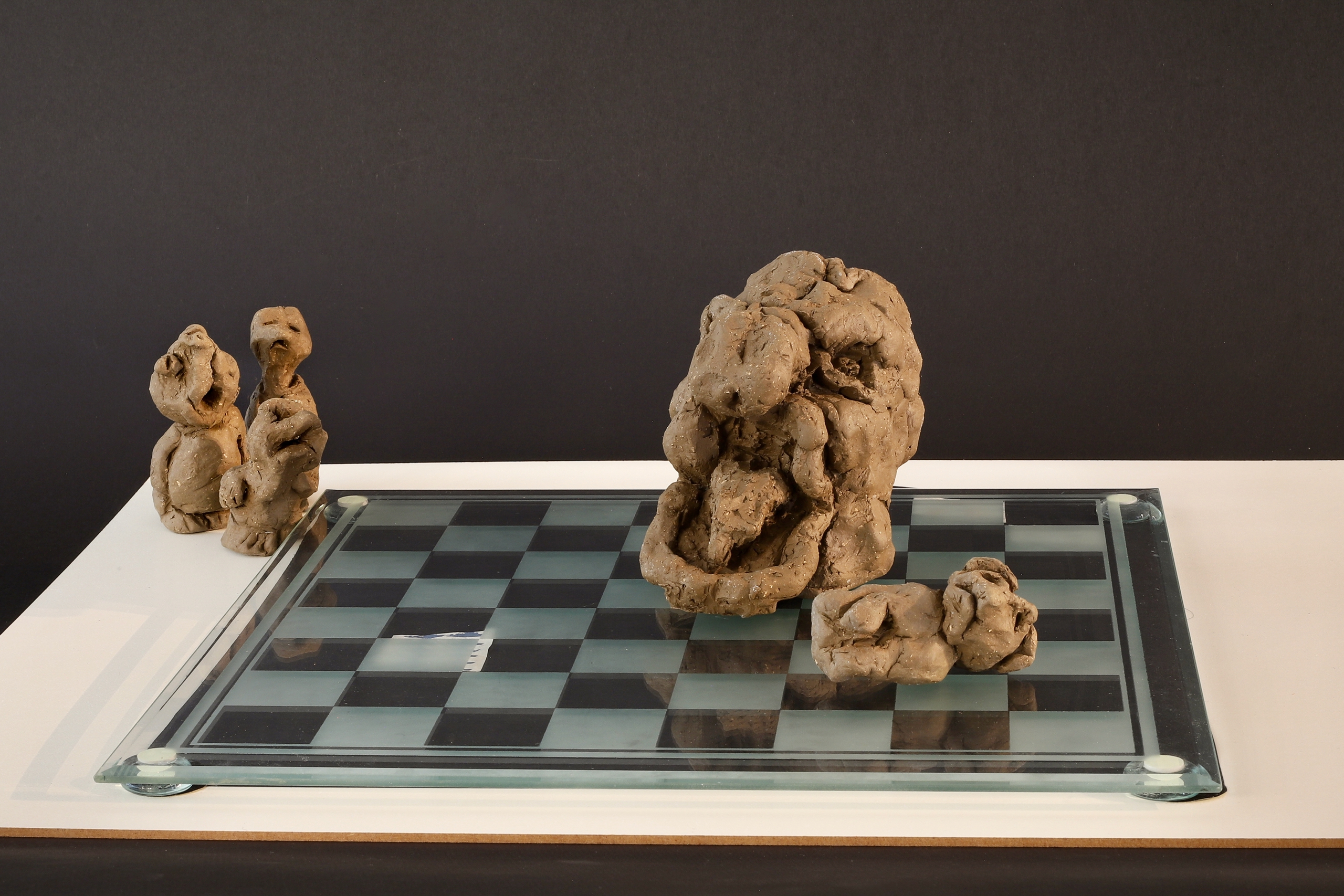 Met 'Schaakmat' geef ik commentaar op de hedendaagse politiek. Het schaakbord stond bij de glasbak. Afbeeldingen (niet zichtbaar op deze foto) komen uit de krant Trouw. Onderplaat is van een kastlade