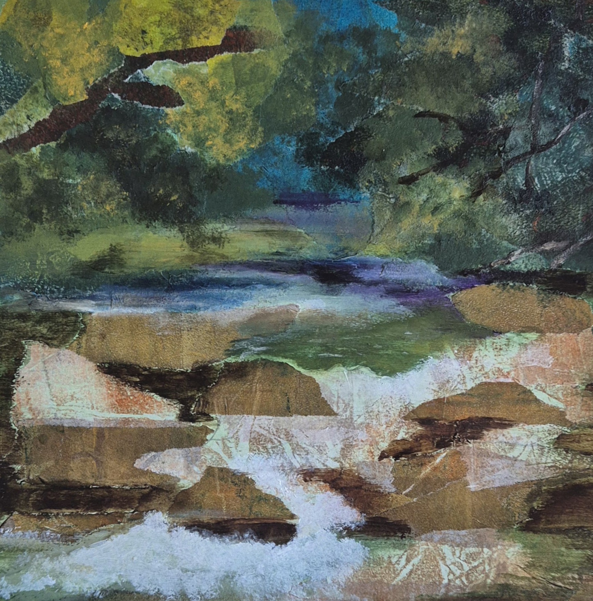 Een collage van een bergstroom. Het werk wordt geleverd in een zwarte lijst met ivoorkleurig passe partout. Maat van ingelijst kunstwerk is 32 x 32 cm. Stuur mij een mail als je interesse hebt. margreetfineart@gmail.com